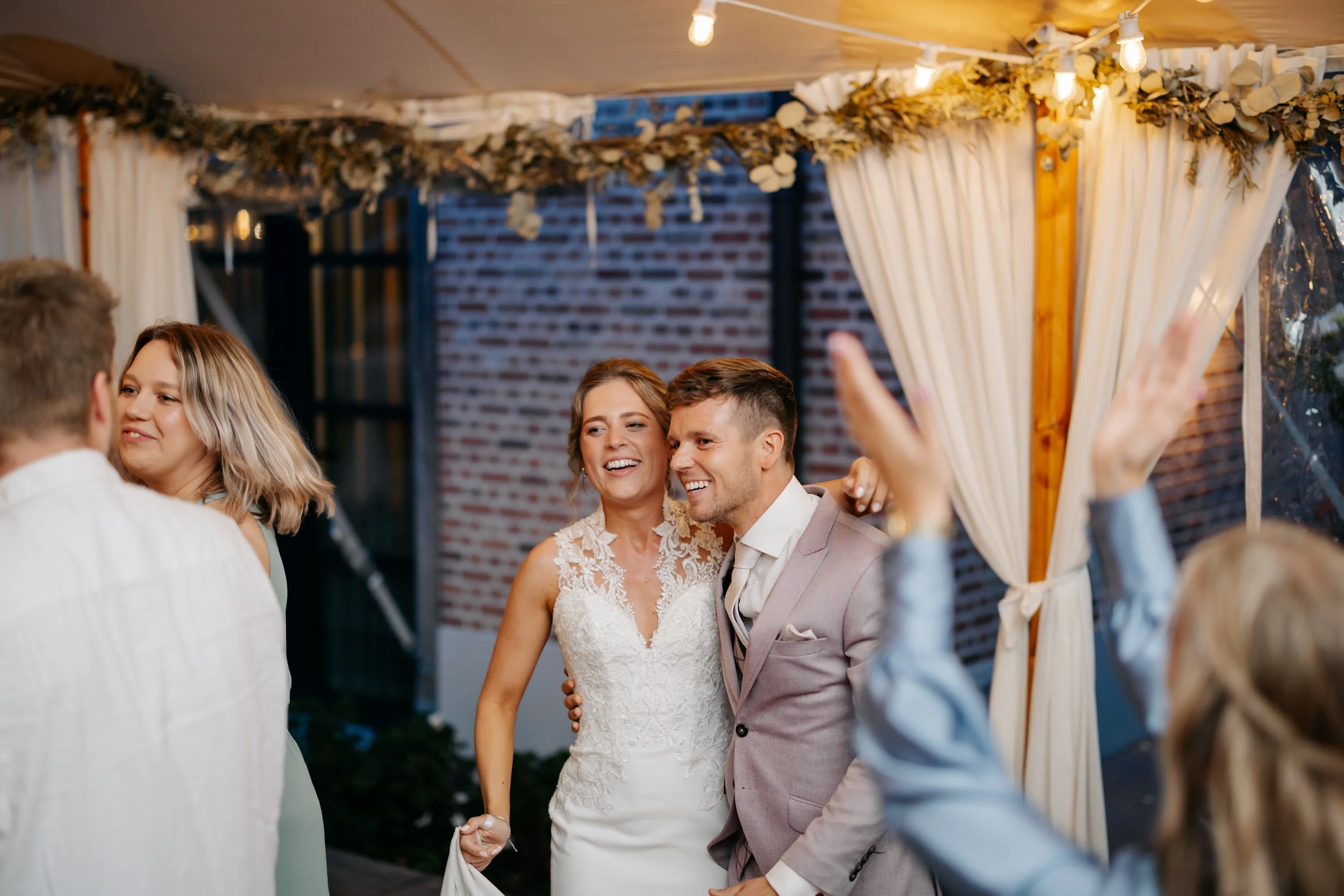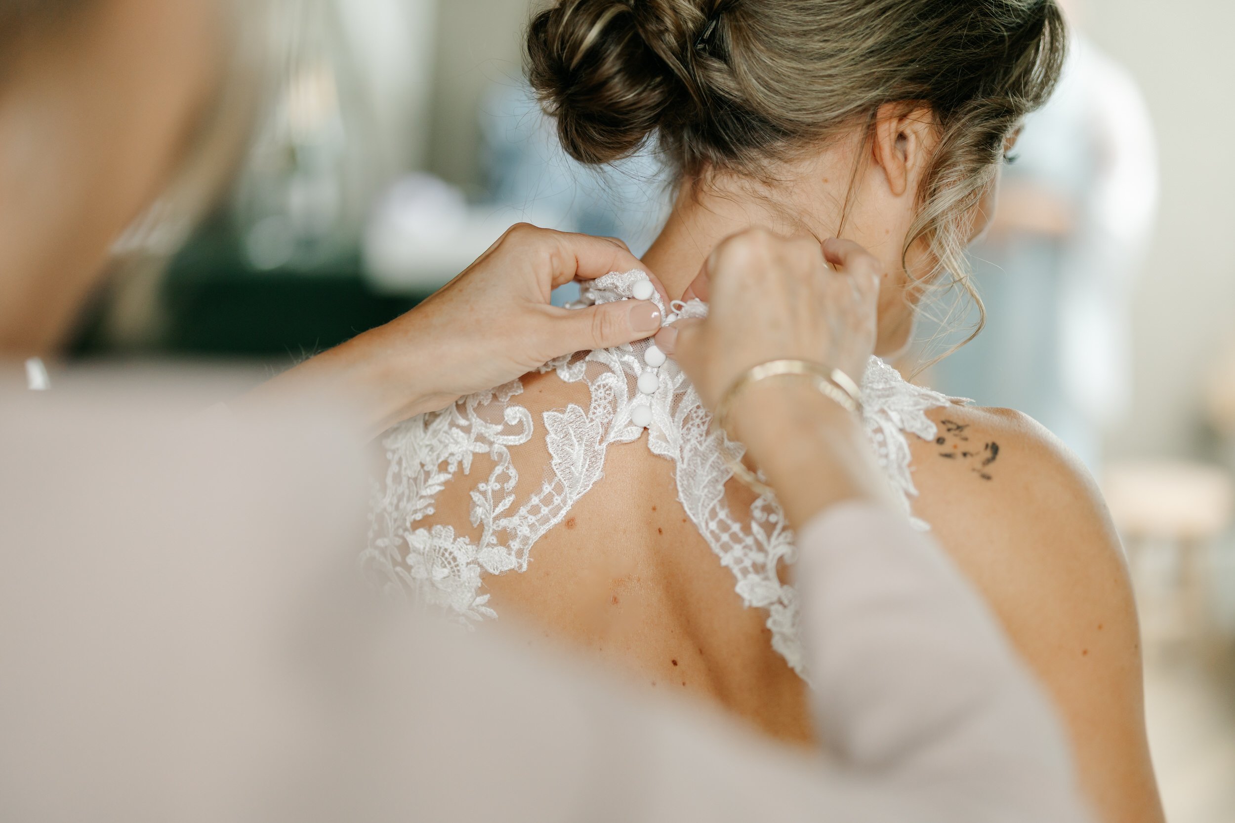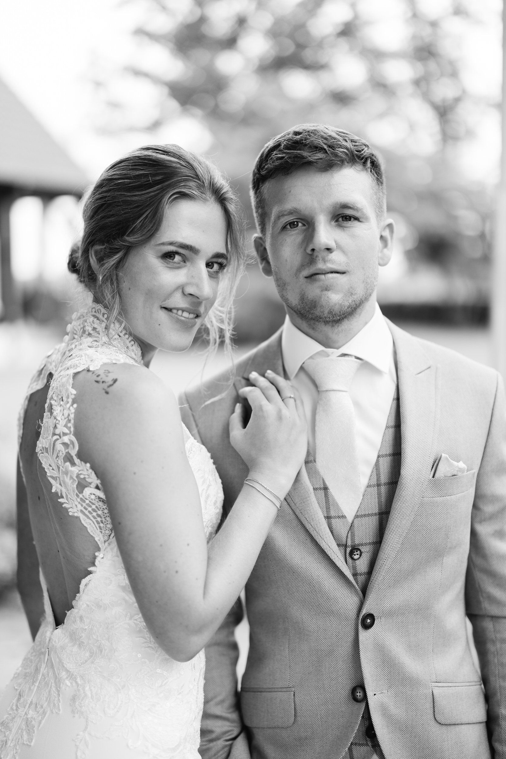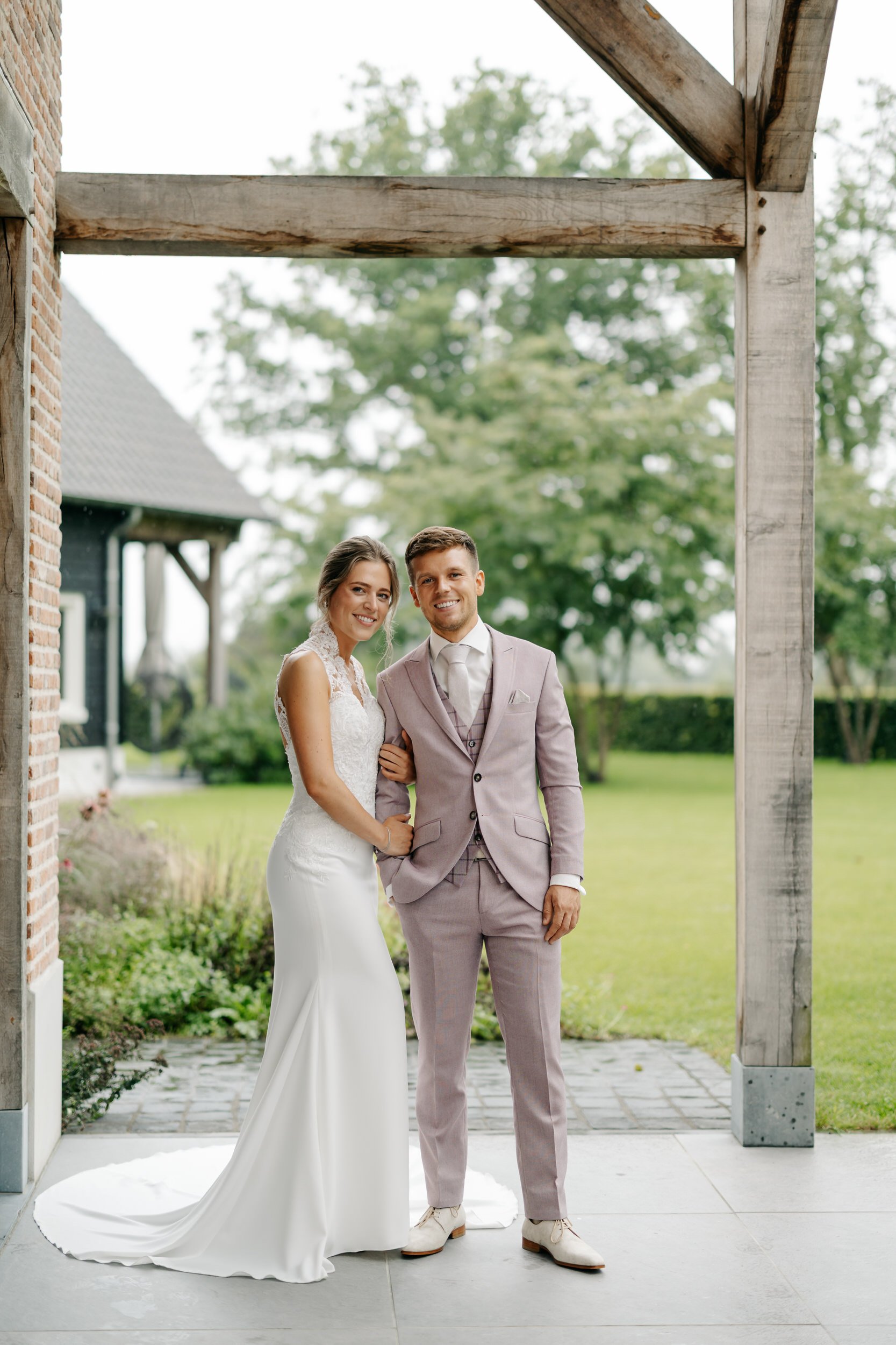 Omdat het ’s ochtends wat regende, hebben we de first look binnen gedaan. Daarna een korte fotoshoot buiten onder een droge overkapping, perfect voor de start. De rest van de fotoshoot deden we later, in de laatste uurtjes daglicht.