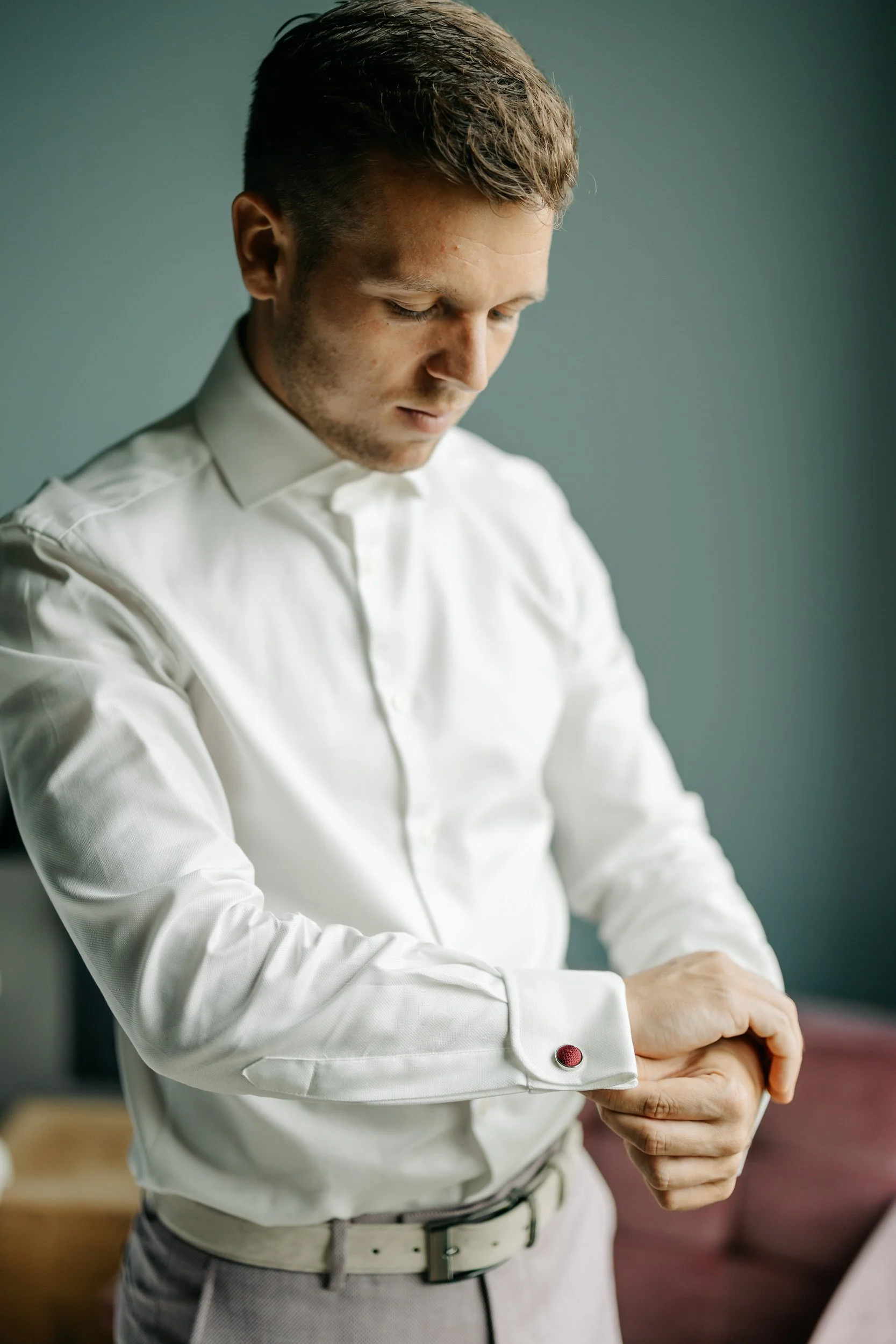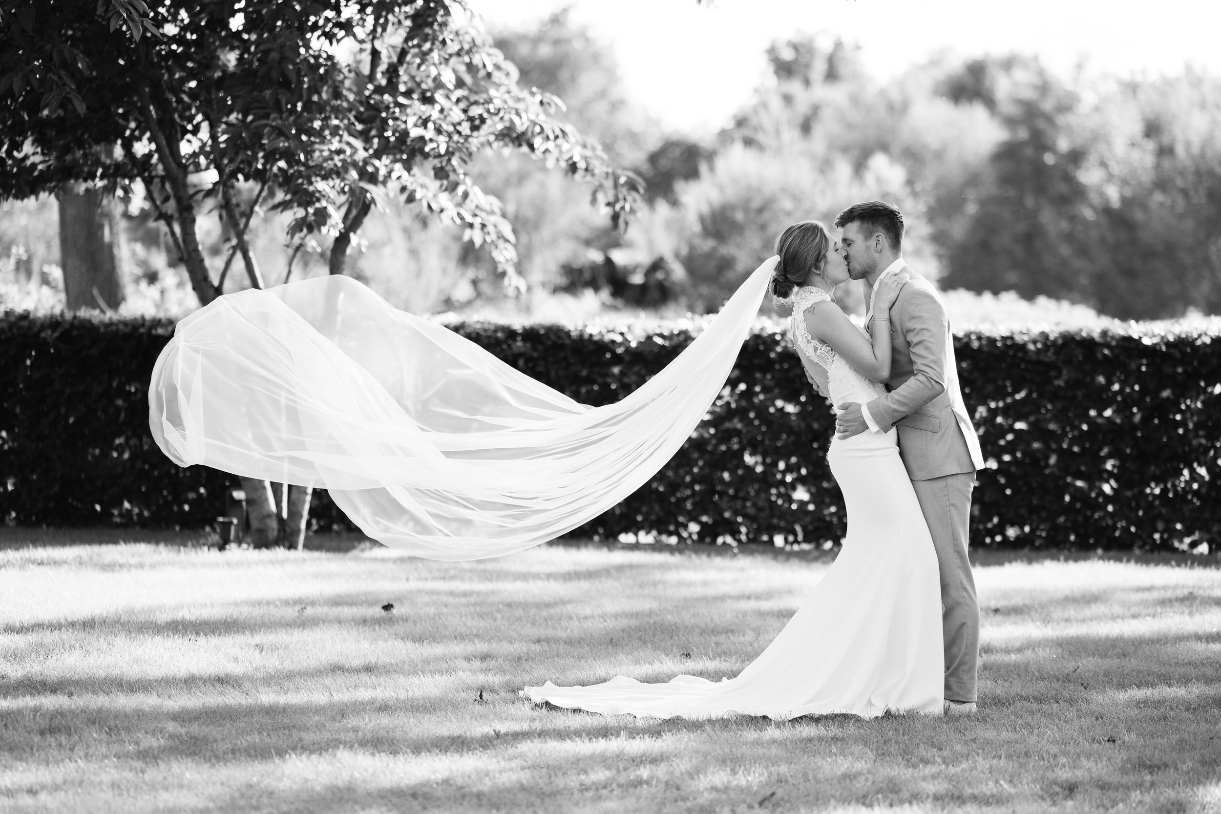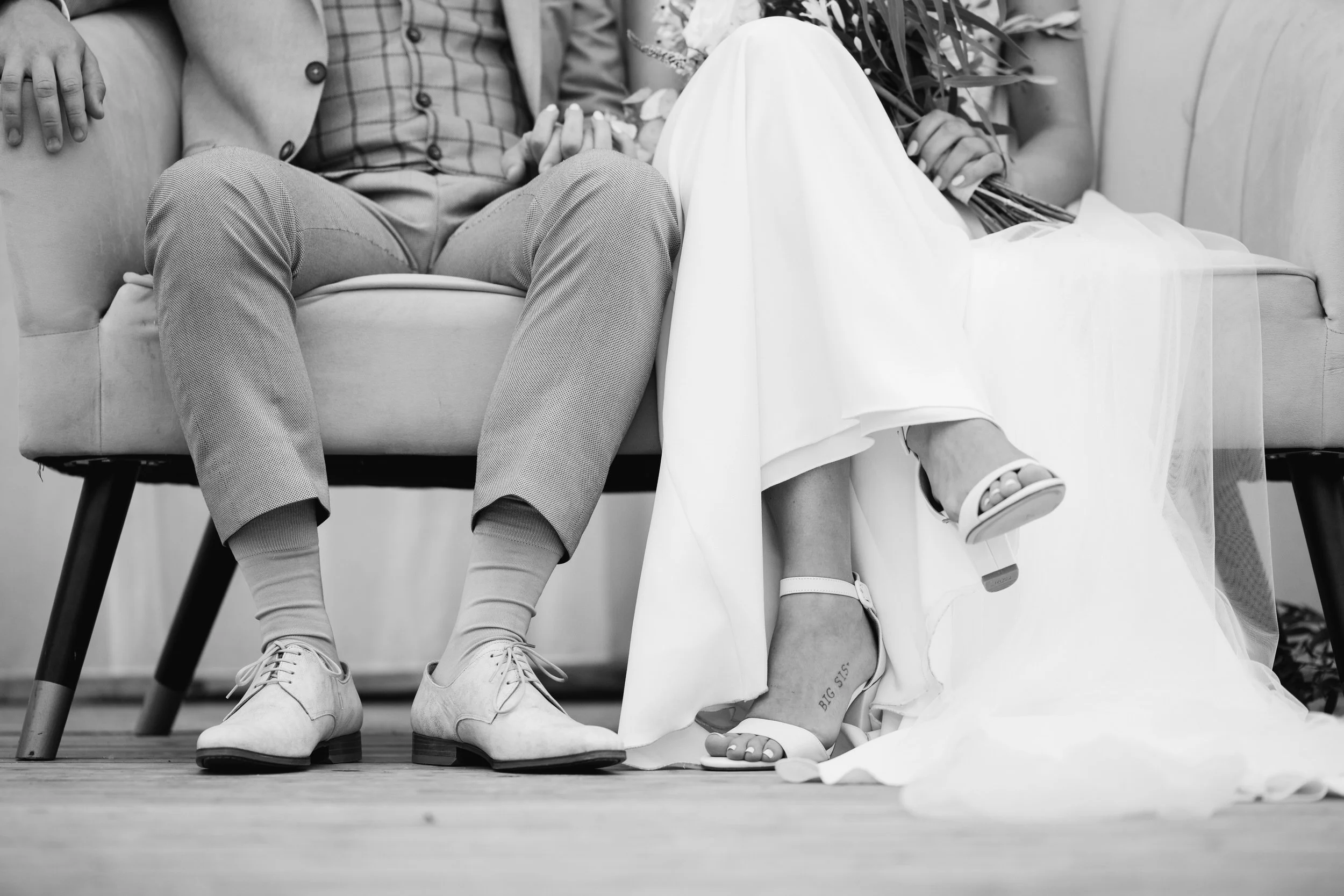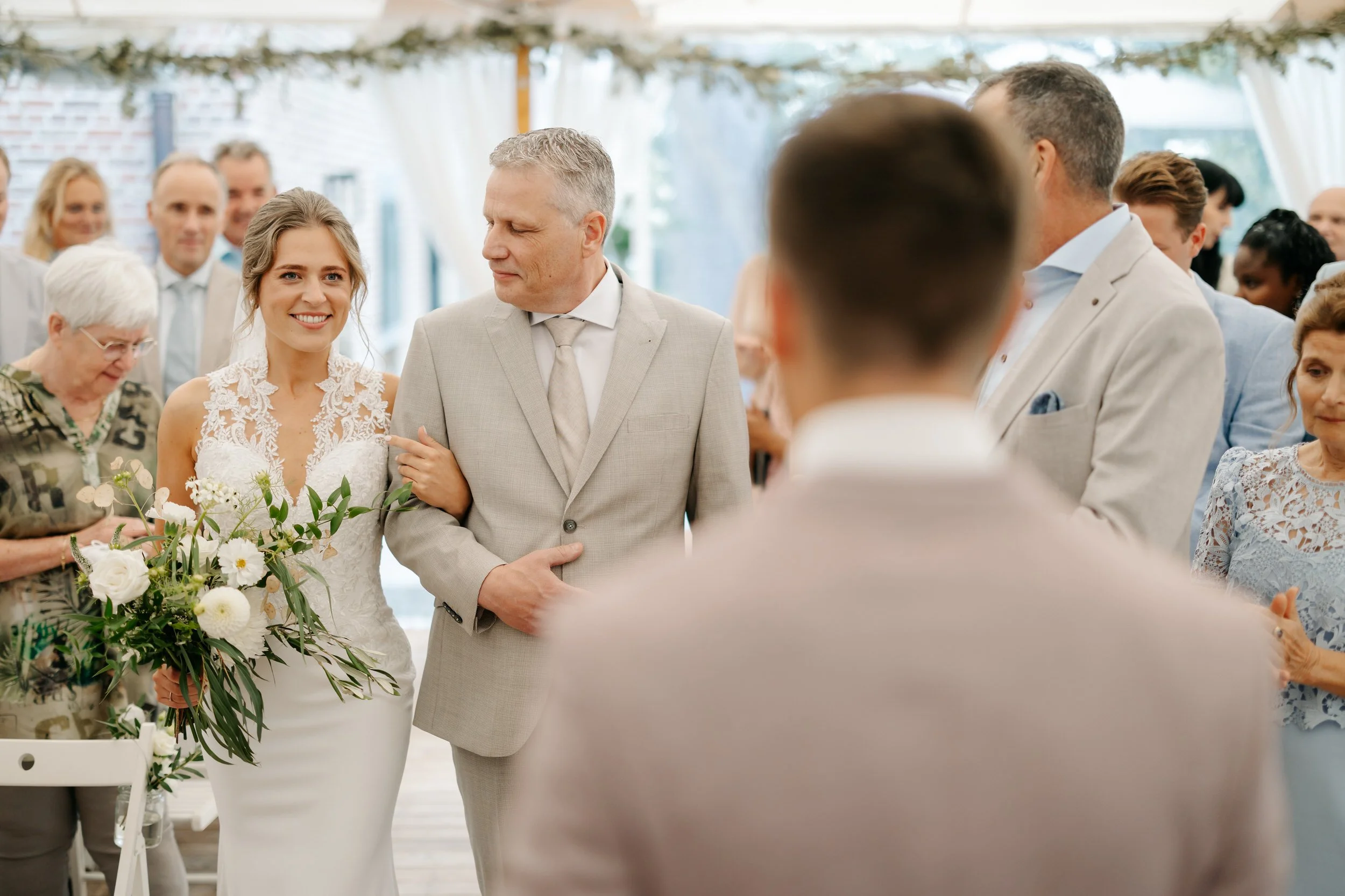 Omdat het ’s ochtends wat regende, hebben we de first look binnen gedaan. Daarna een korte fotoshoot buiten onder een droge overkapping, perfect voor de start. De rest van de fotoshoot deden we later, in de laatste uurtjes daglicht.
