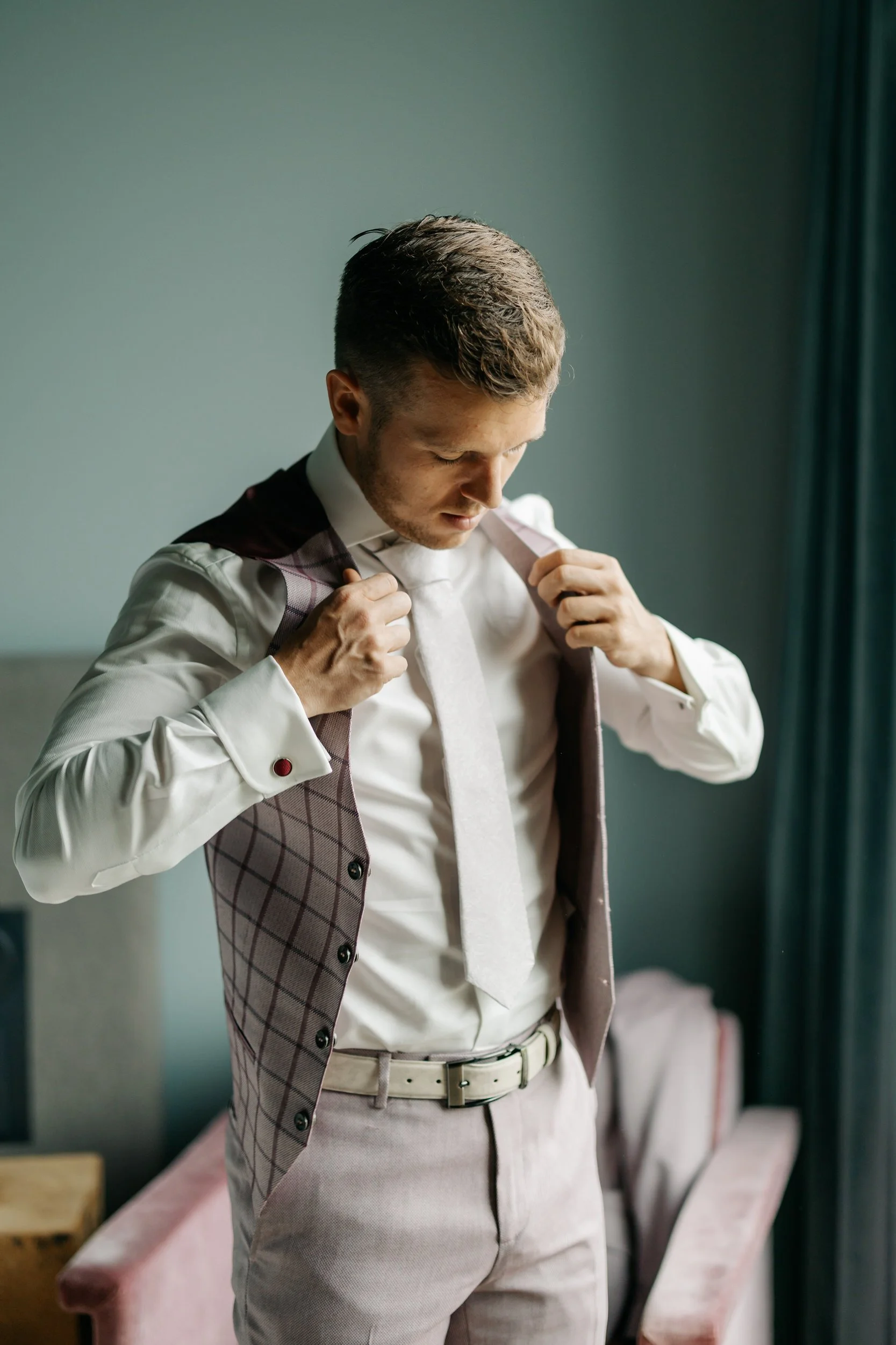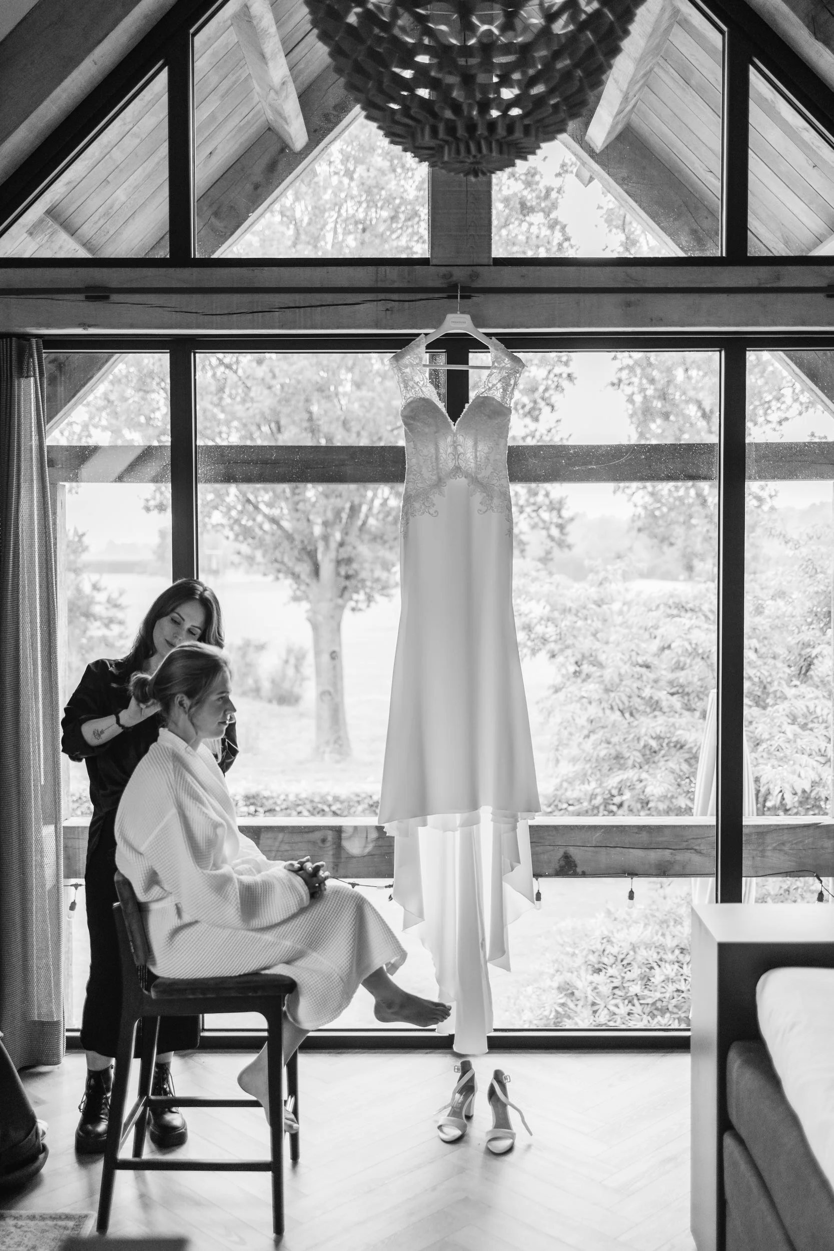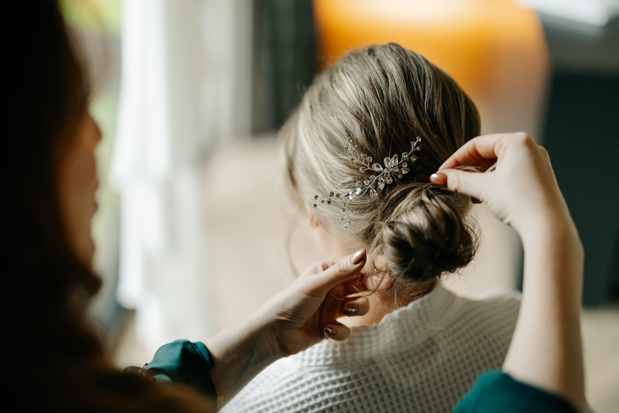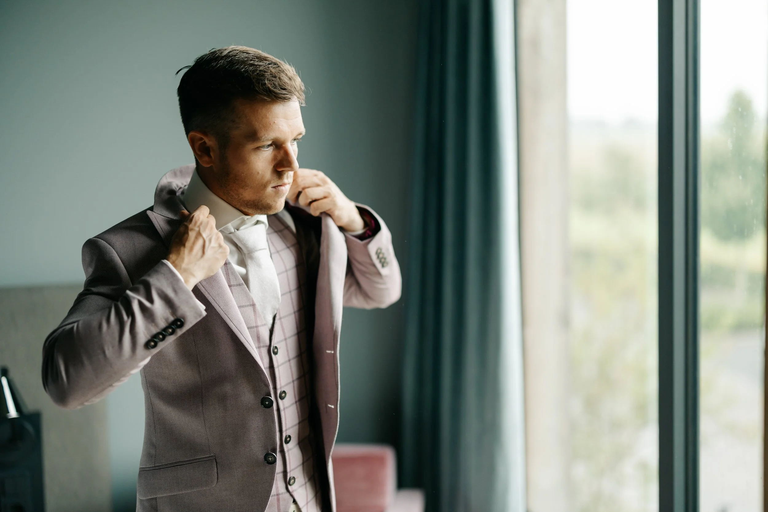 De bruiloft van Fin & Marieke startten we bij Fin, die zich in één van de gastvertrekken aan het klaarmaken was. Waanzinnig groot raam met uitzicht! Daarna gingen we naar Marieke. Toen we daar aankwamen zat zij in de laatste 15–20 minuten van haar en make-up. Wauw, wat een bruidssuite!