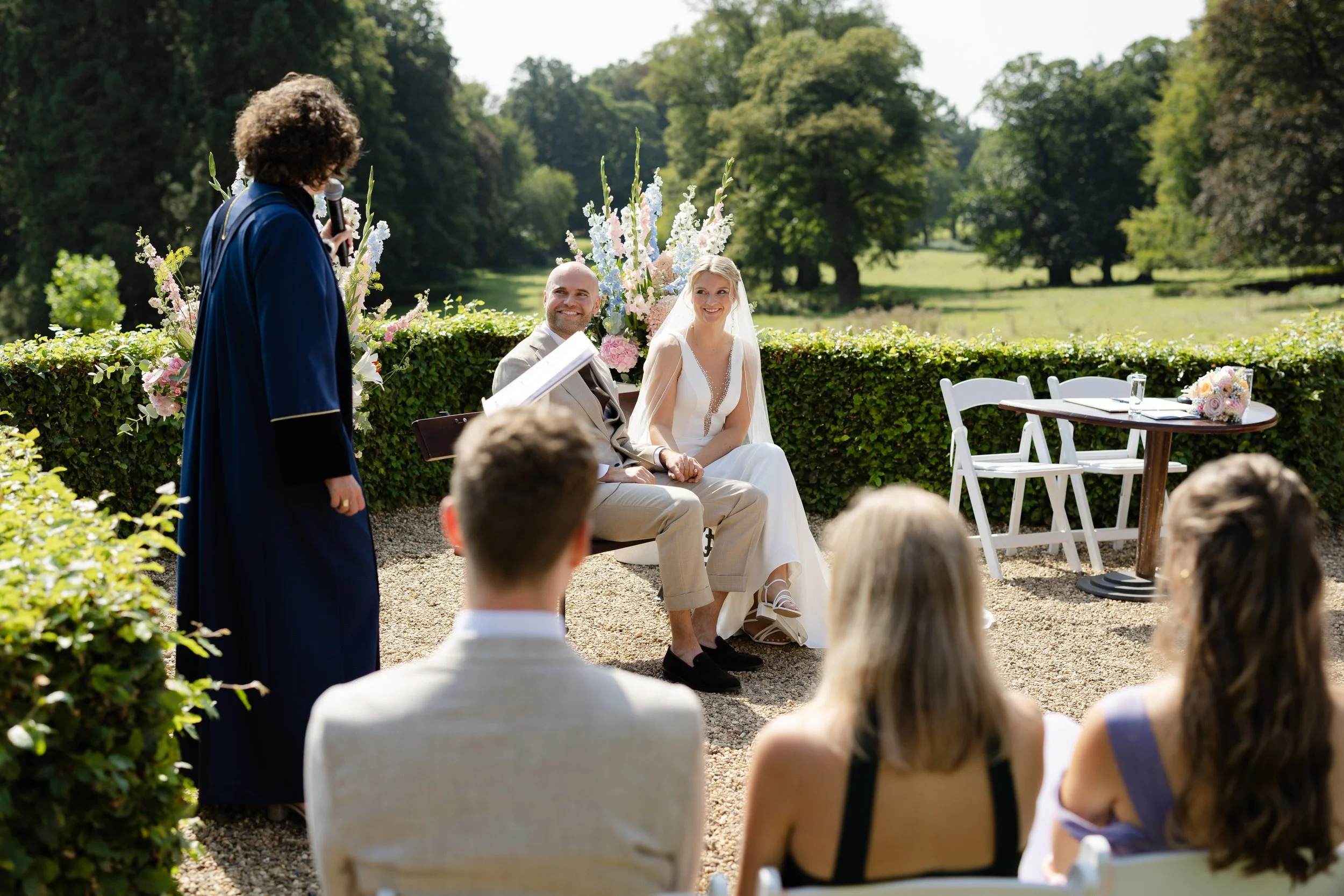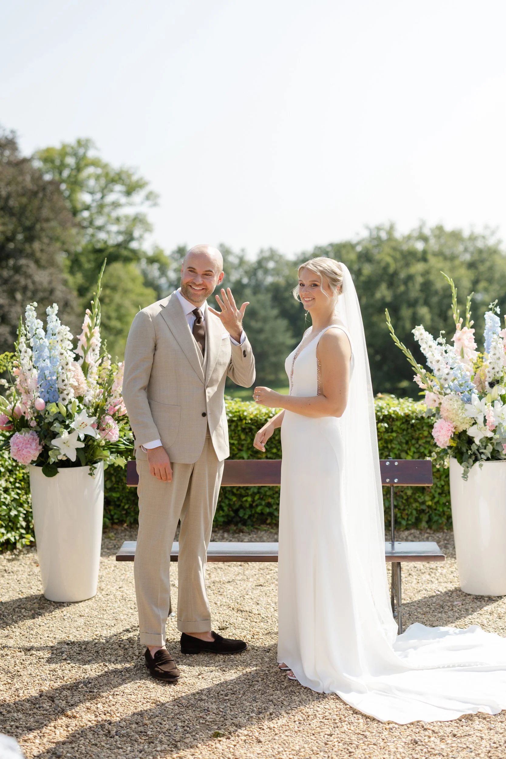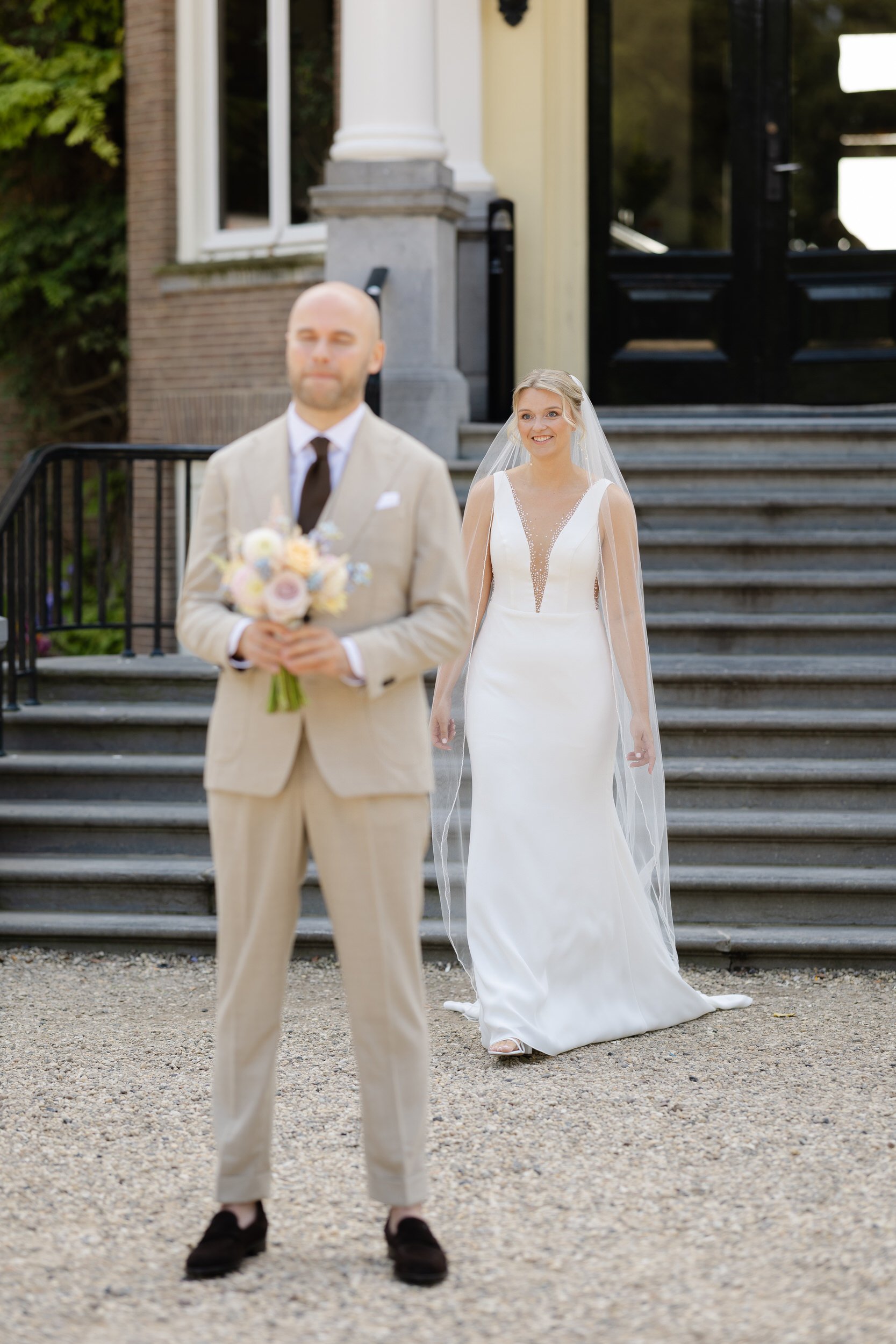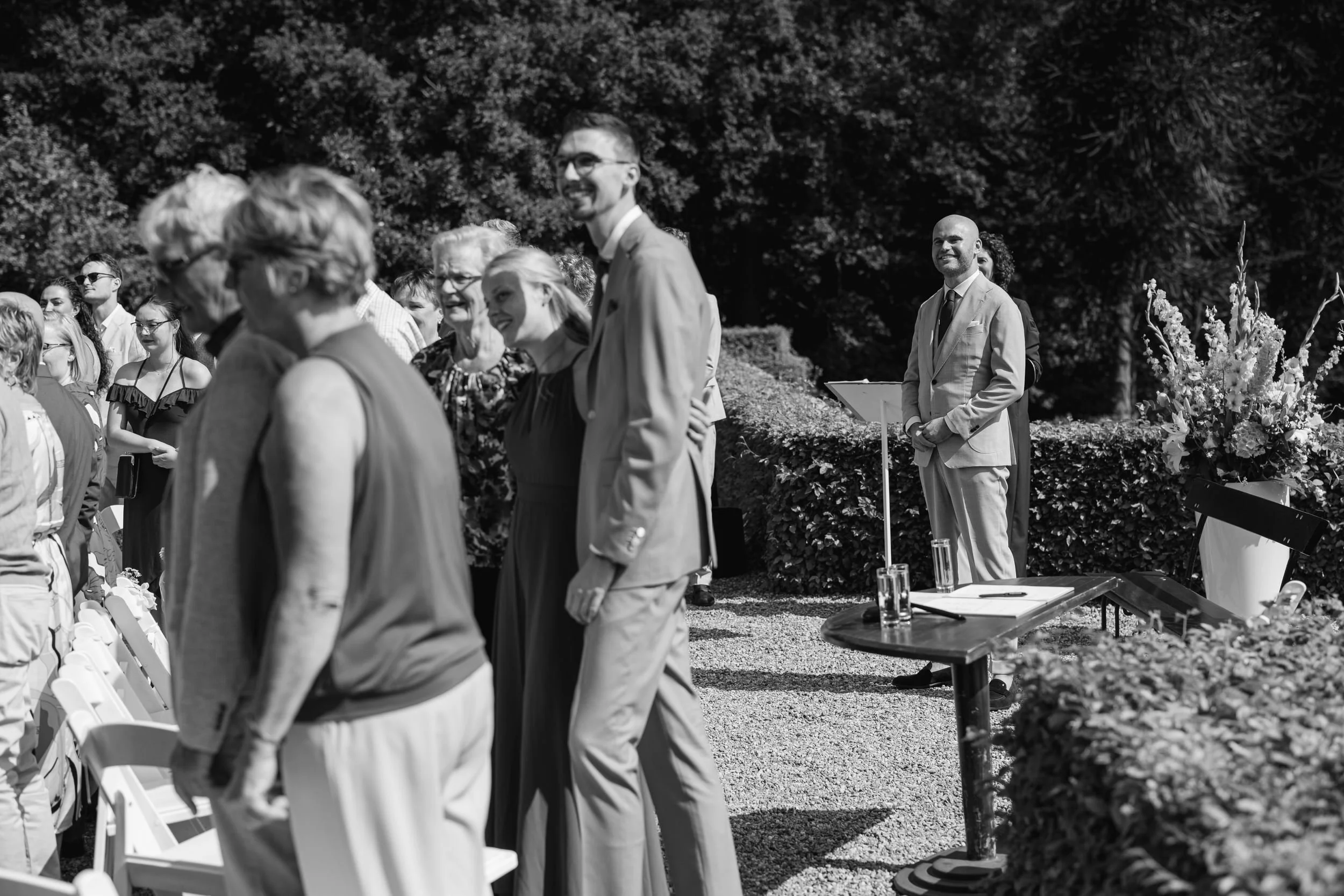 Jesse en Ellen liepen allebei van een andere kant de ceremonie in bij Landgoed Rhederoord. Via twee bordestrappen, links en rechts, richting elkaar. Samen kwamen ze uit bij de ceremonie, precies op het moment dat de gasten hen voor het eerst zagen.