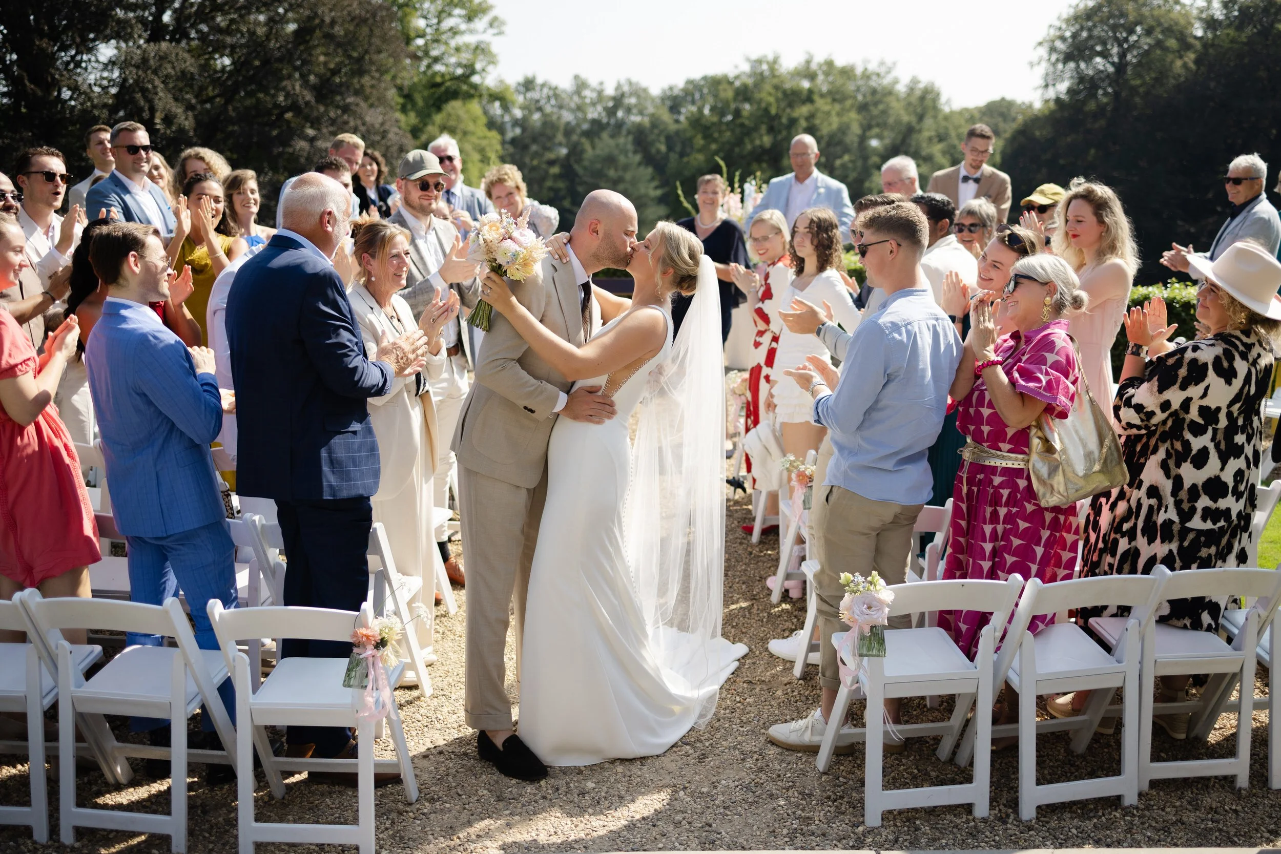 Wat deze dag sterk maakte, waren de kleine momenten. Jesse’s broertje die de ringen bracht. Jesse die daarna zelf het woord nam voor de toast. En later tijdens het diner een persoonlijke slideshow met video’s en ingesproken berichten van gasten. Dat soort details maken een bruiloft eigen. En zorgen ervoor dat je bij het terugkijken weer voelt hoe het was.