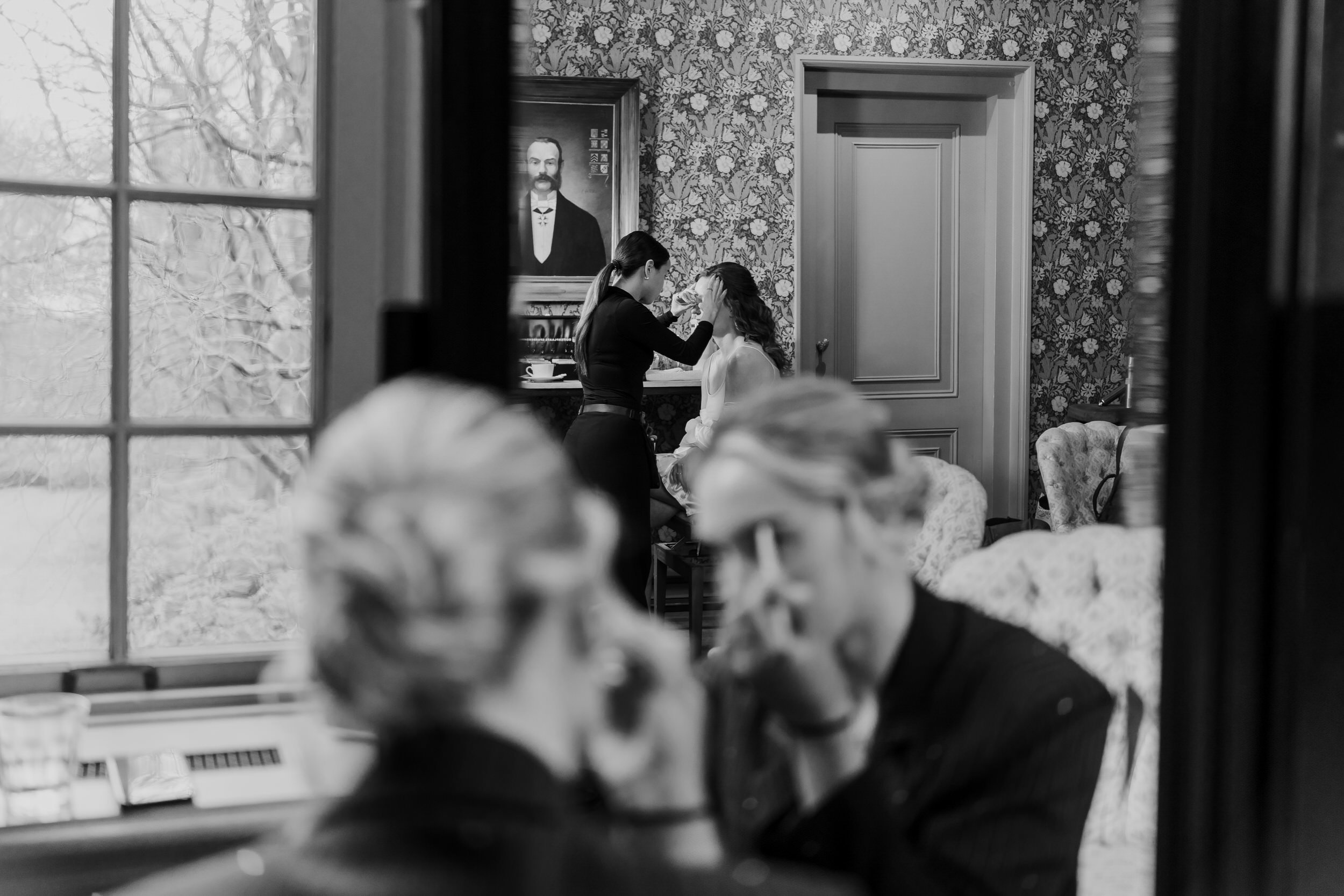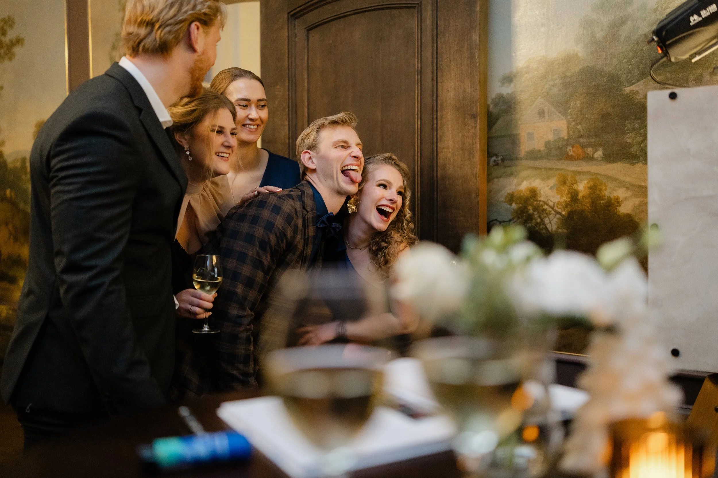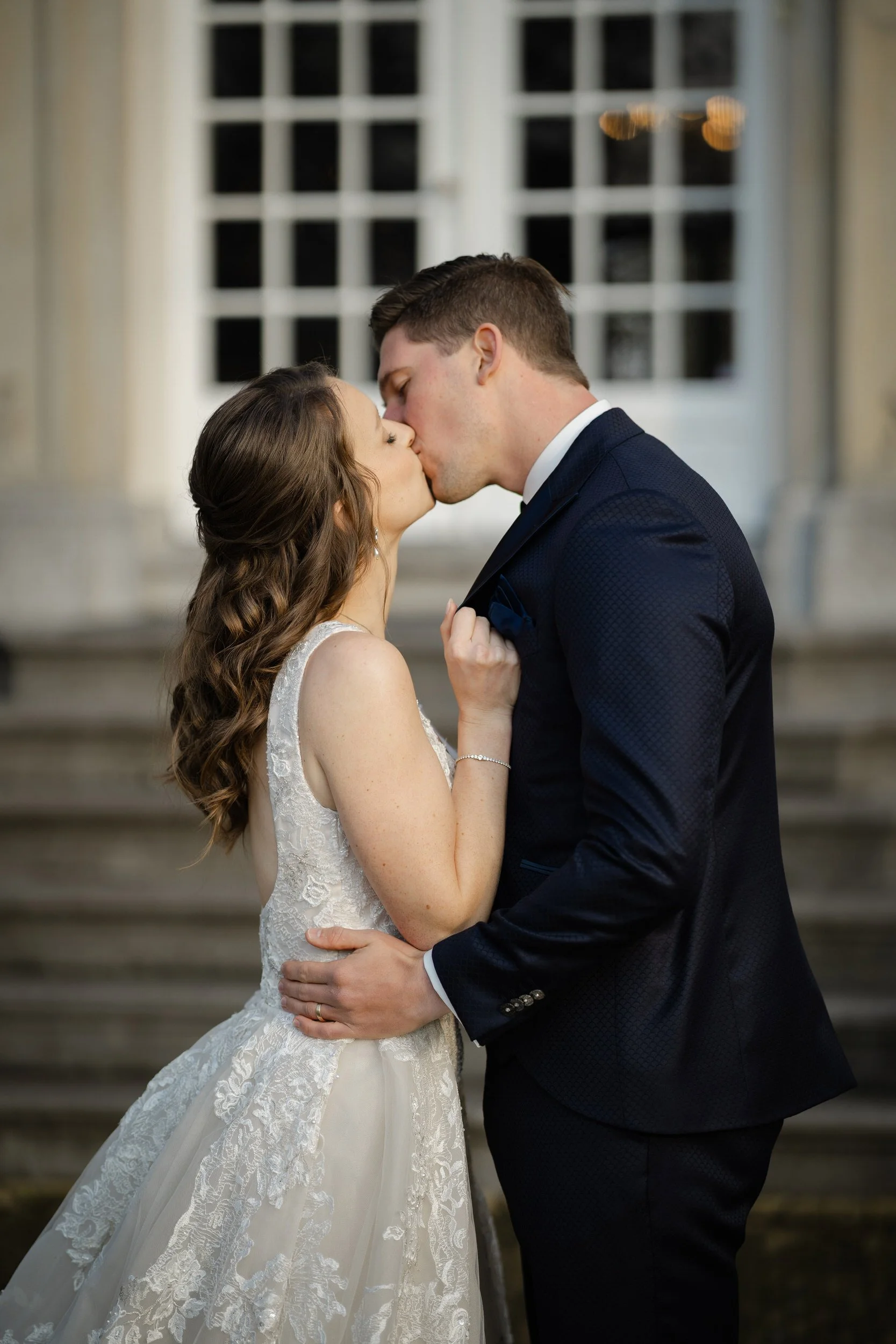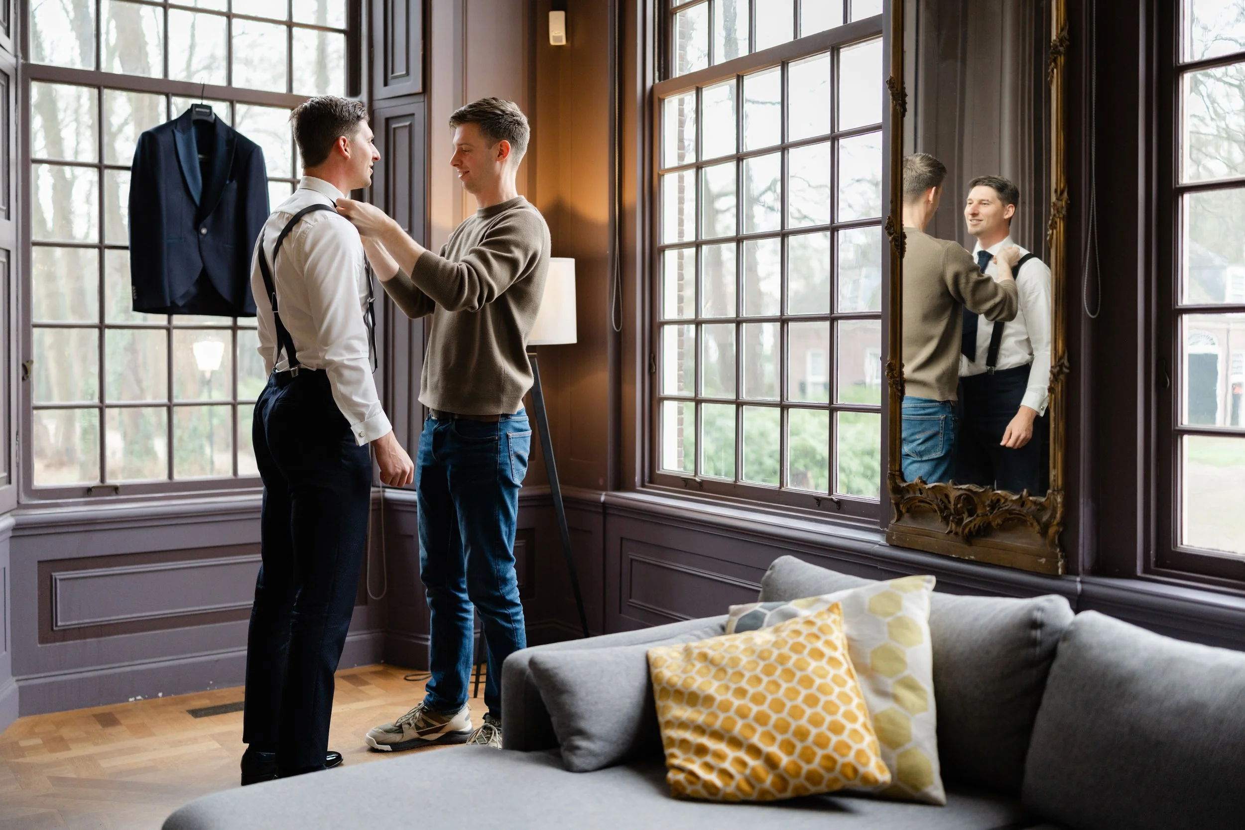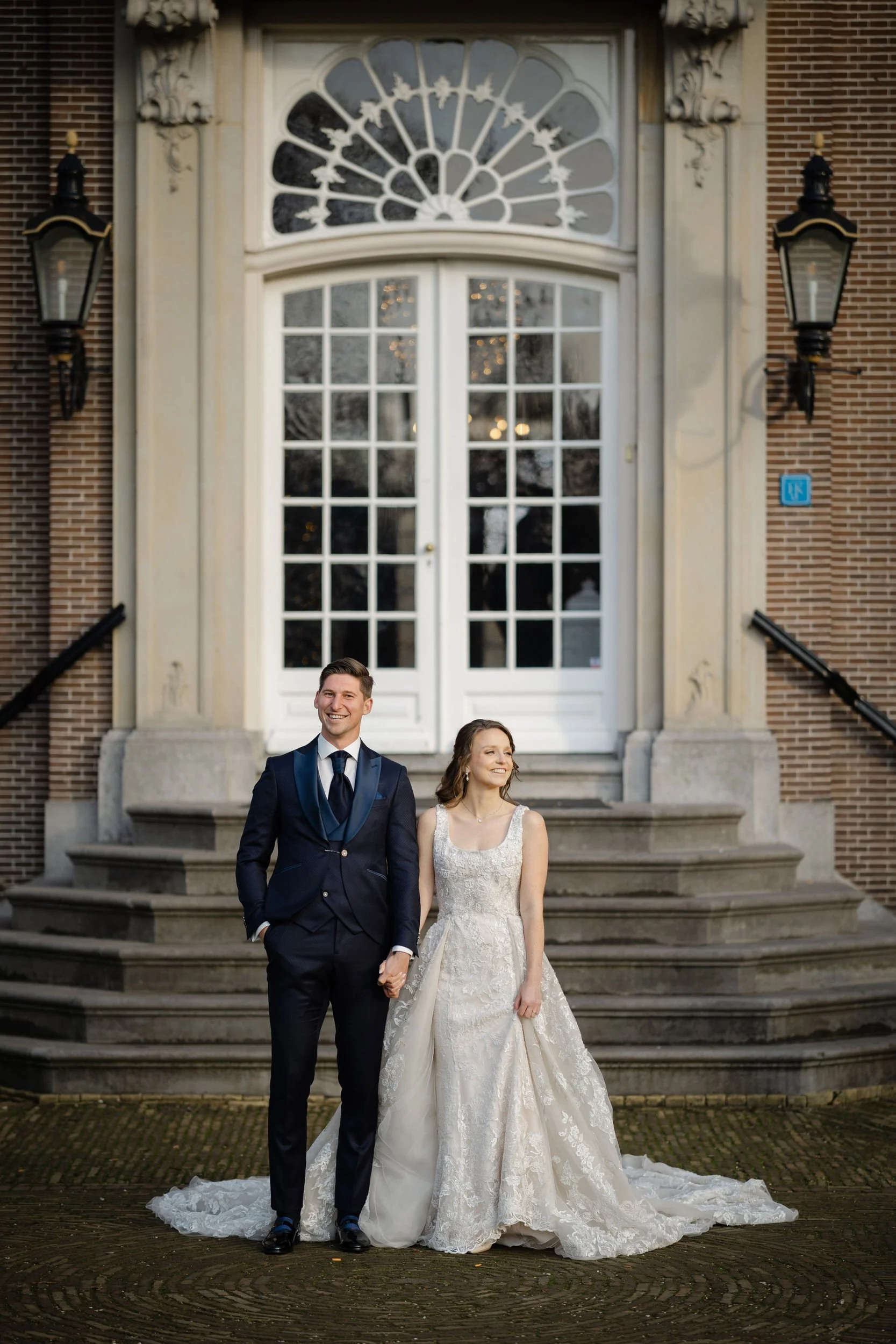 We begonnen de ochtend bij Emile met zijn get ready, Pleun volgde kort daarna en was boven al bezig met de visagie. Rond het middaguur was het tijd voor de first look, buiten op de trap. Zo’n moment blijft bijzonder, even alleen samen, voordat alles losbarst. Daarna deden we meteen een korte fotoshoot op en rondom de locatie. Met simpele directie en prompts hebben we echt een knaller van een shoot neergezet.