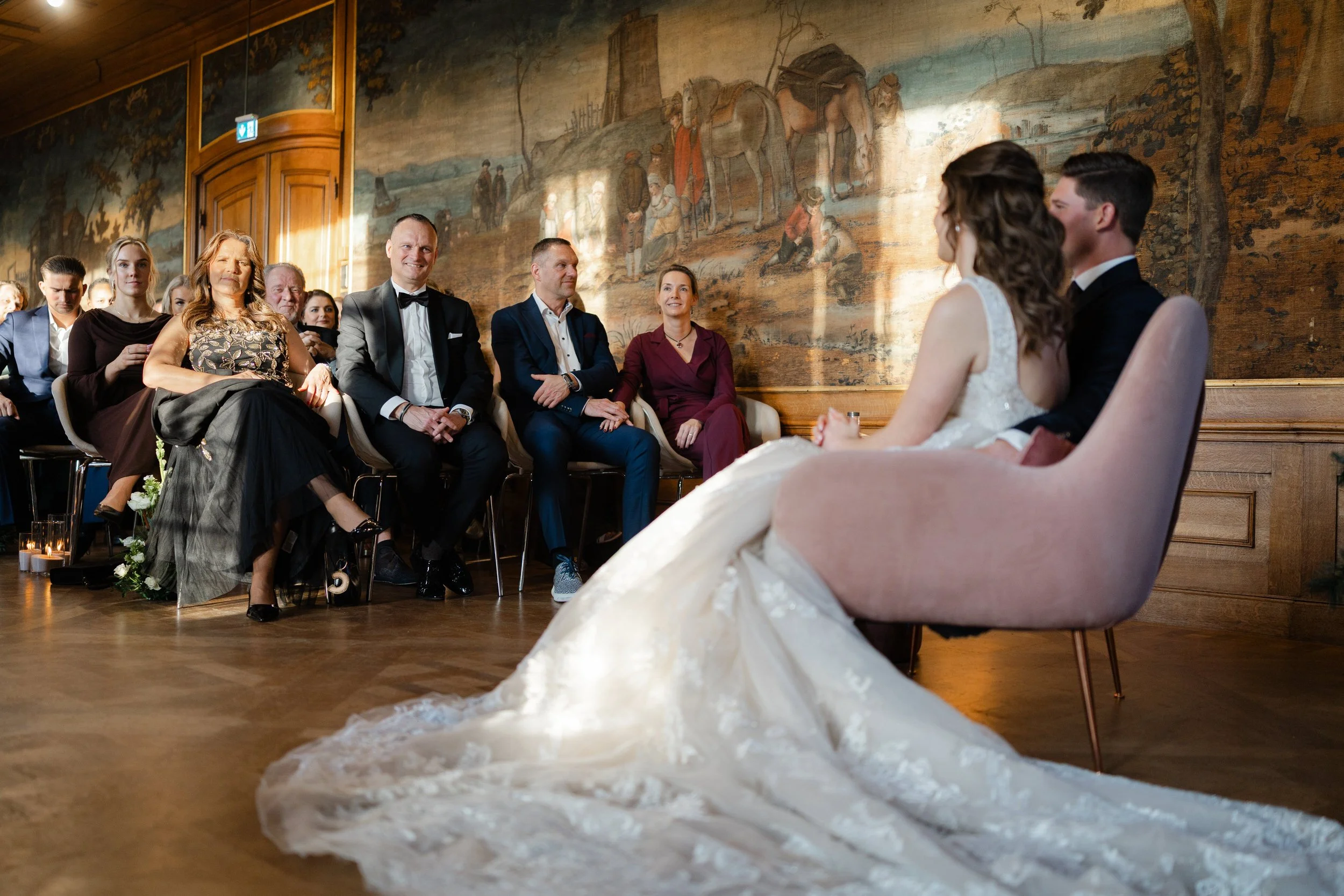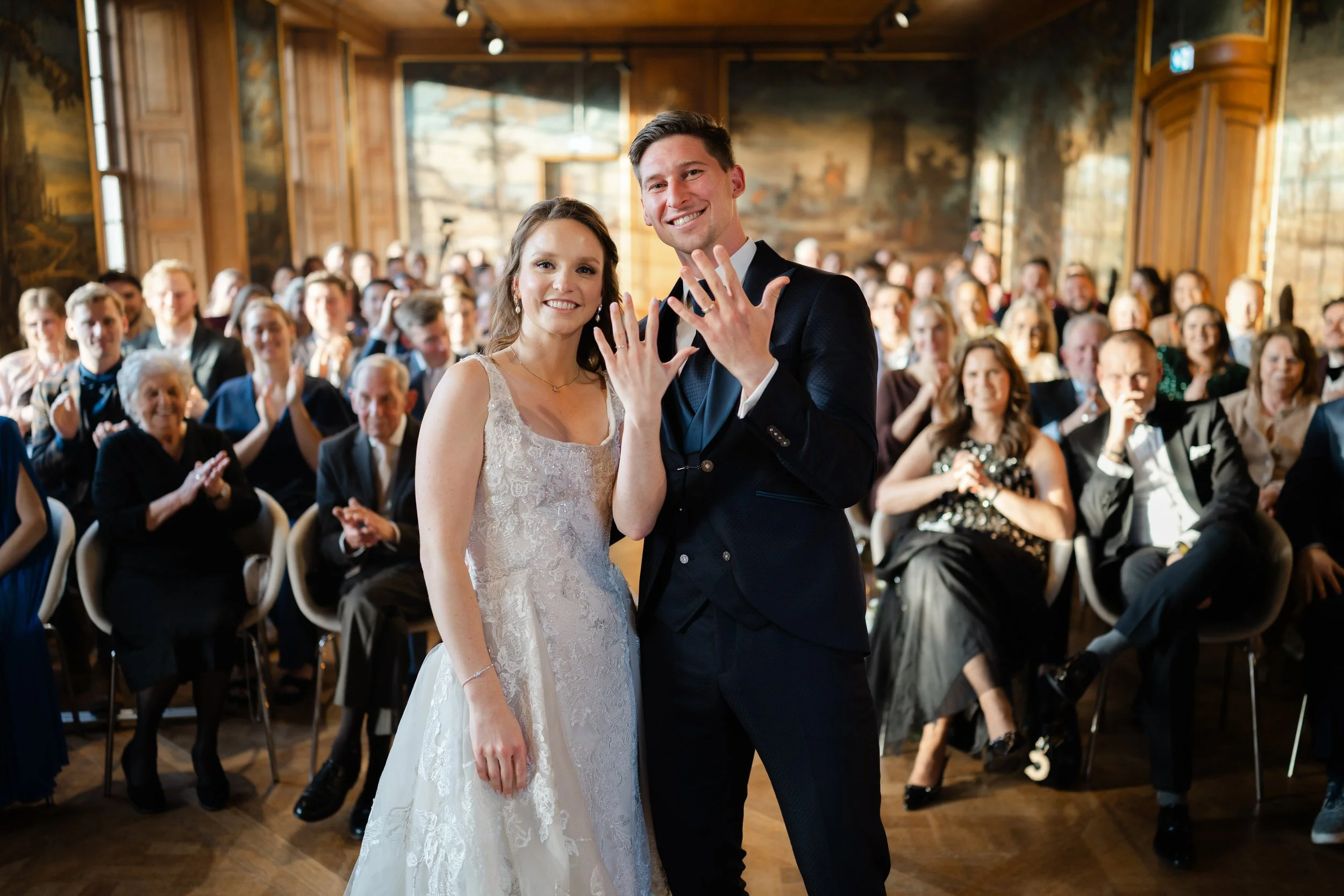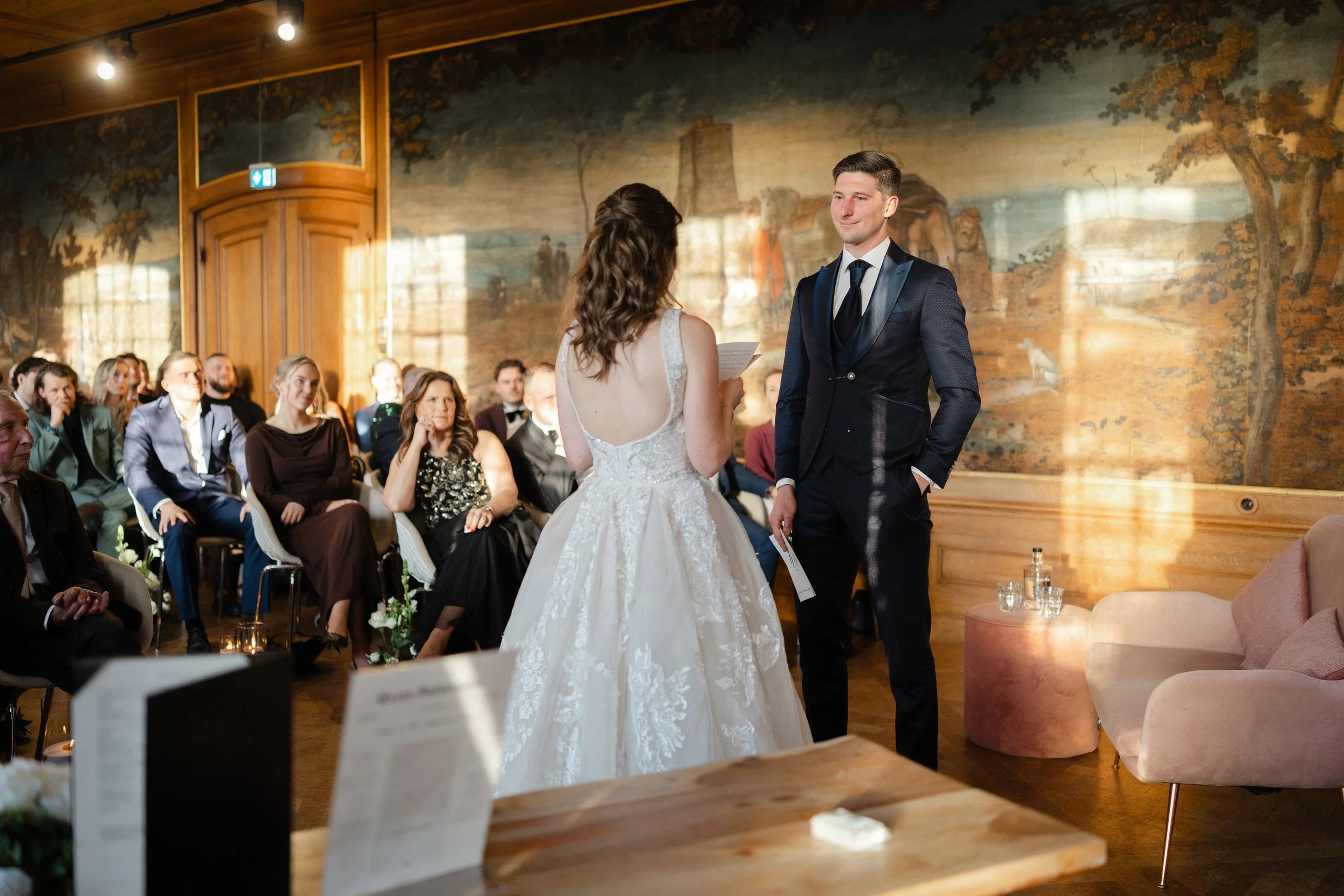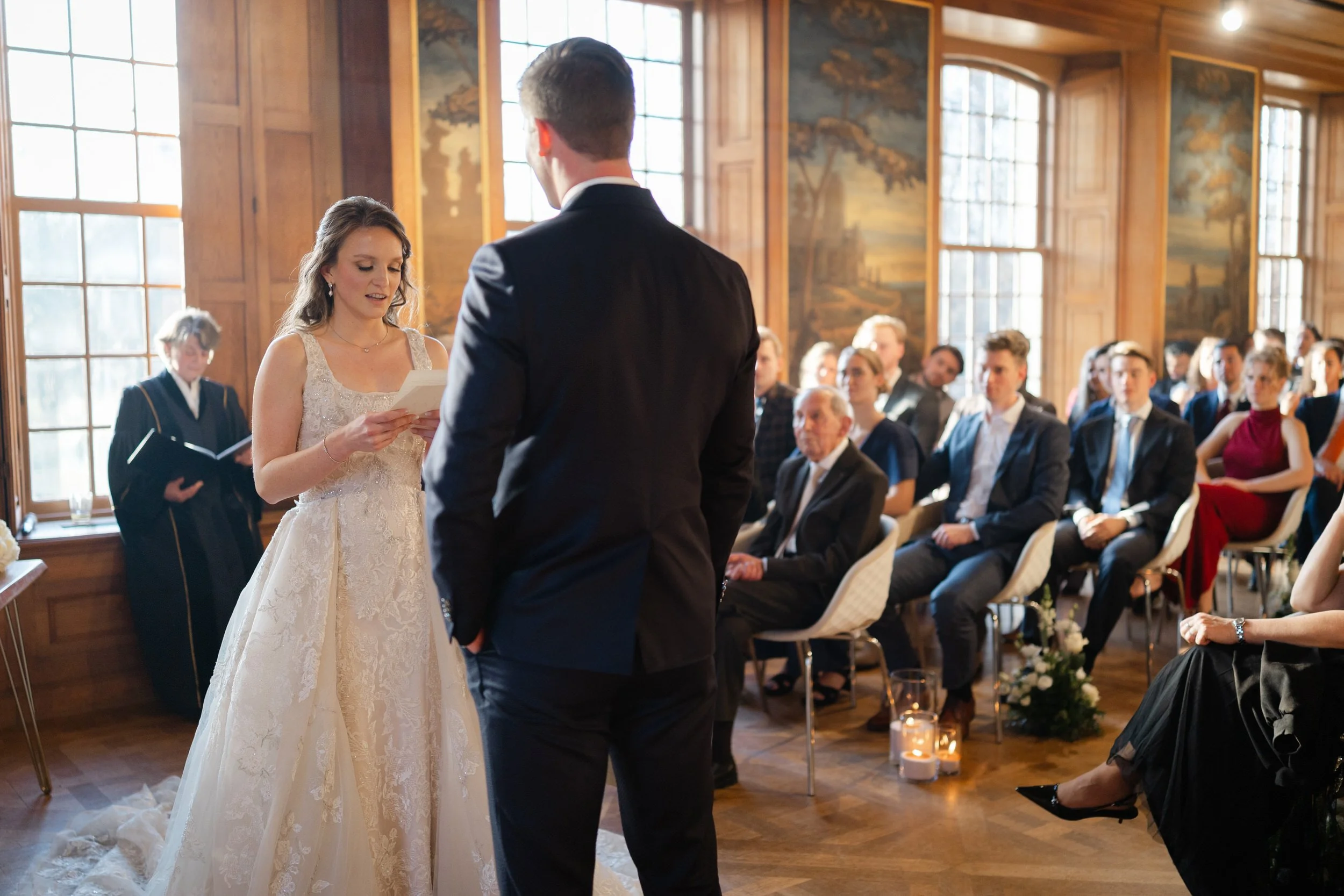 De ceremonie vond plaats in de Raadzaal. Emile kwam binnen met zijn moeder, Pleun met haar vader. Daarna volgden persoonlijke geloften, een kusmoment en samen weer naar buiten. Aansluitend trokken ze zich even terug en maakten ze hun entree voor taart en toast, met de moeders die het proostmoment openden. Super leuk moment.