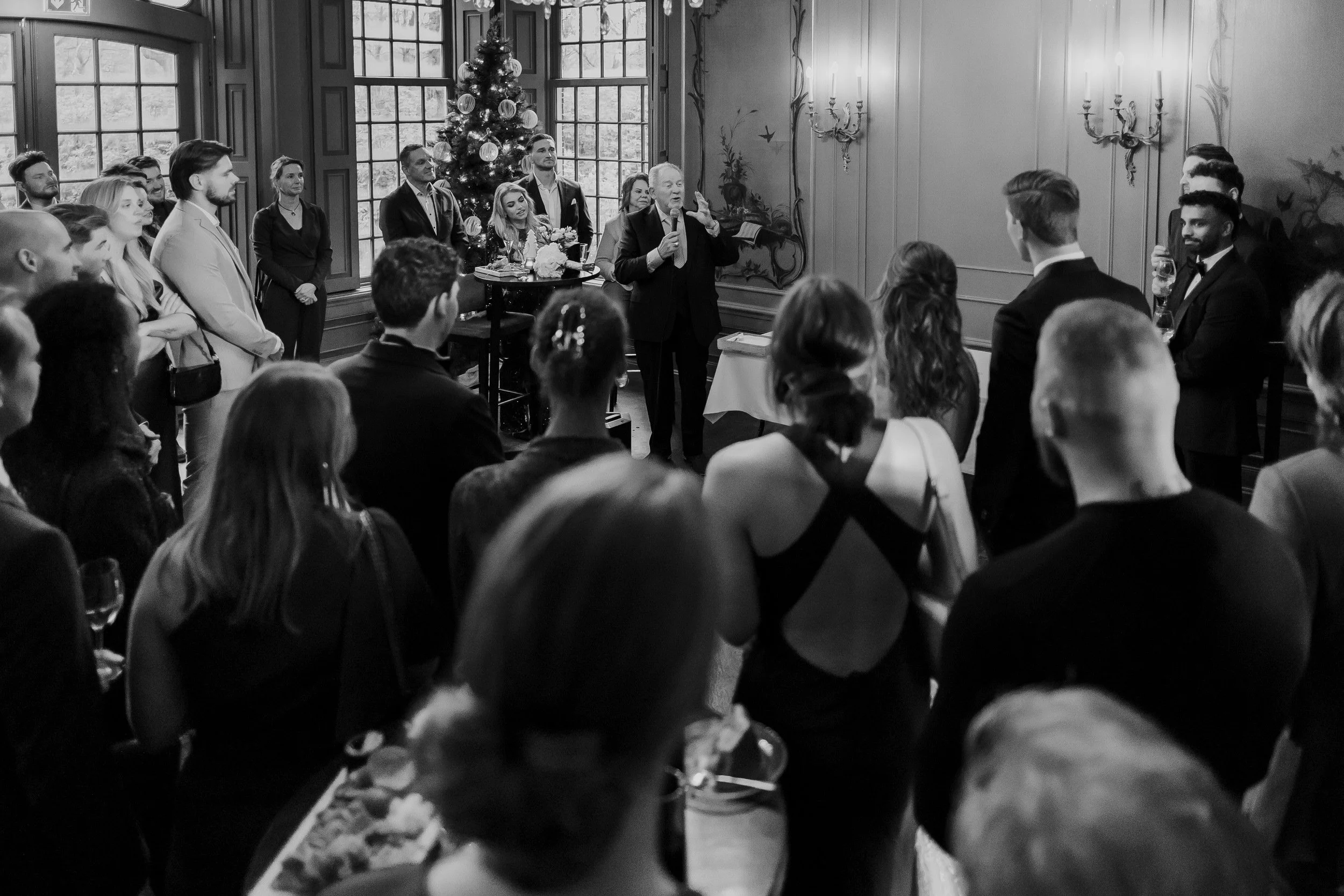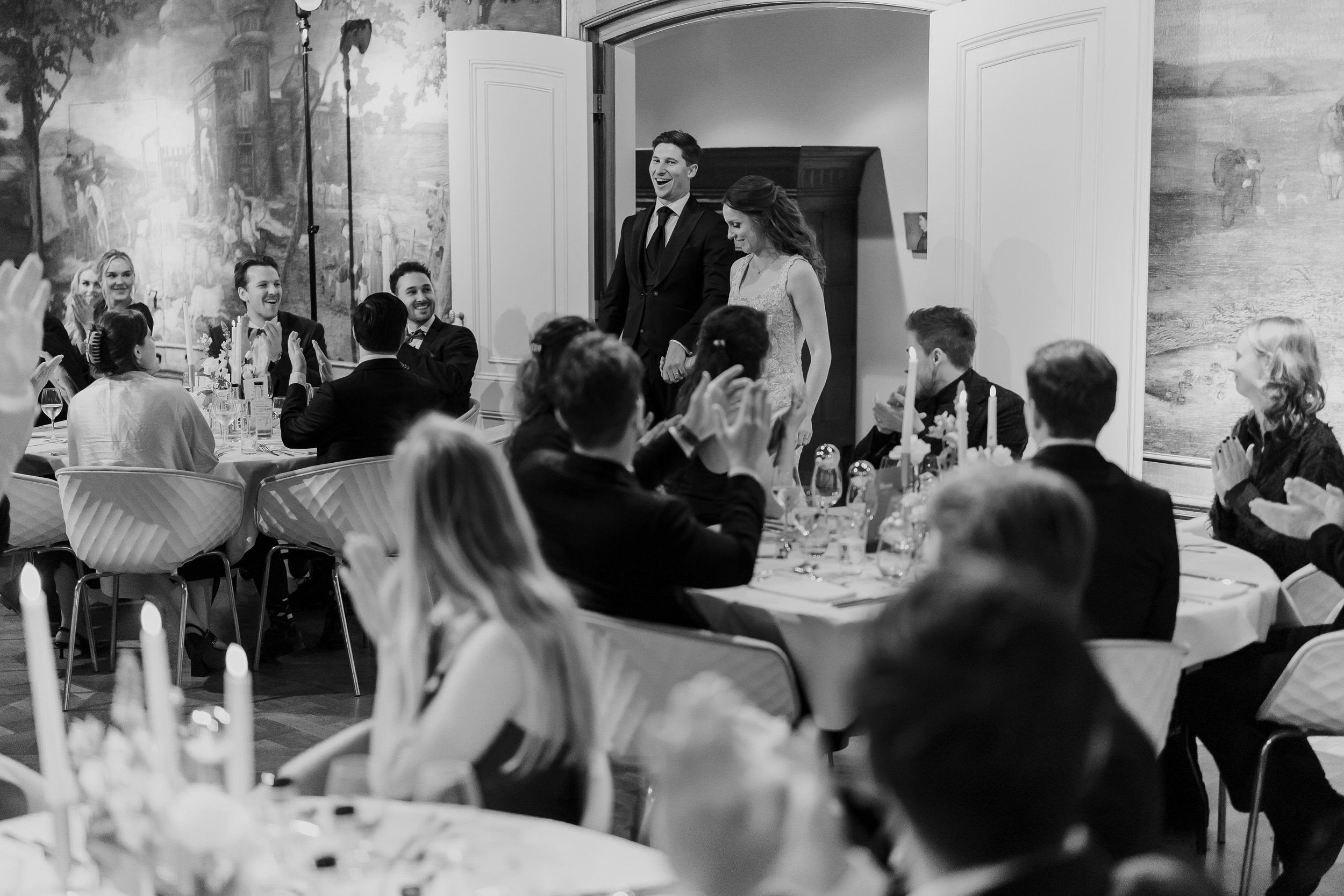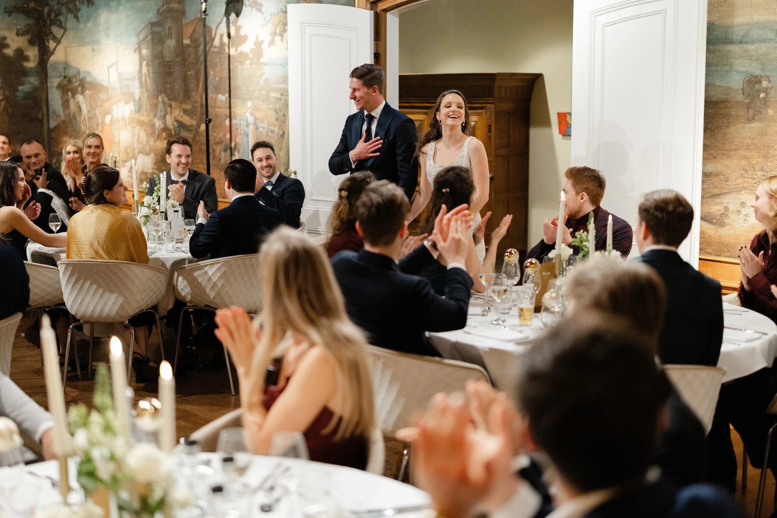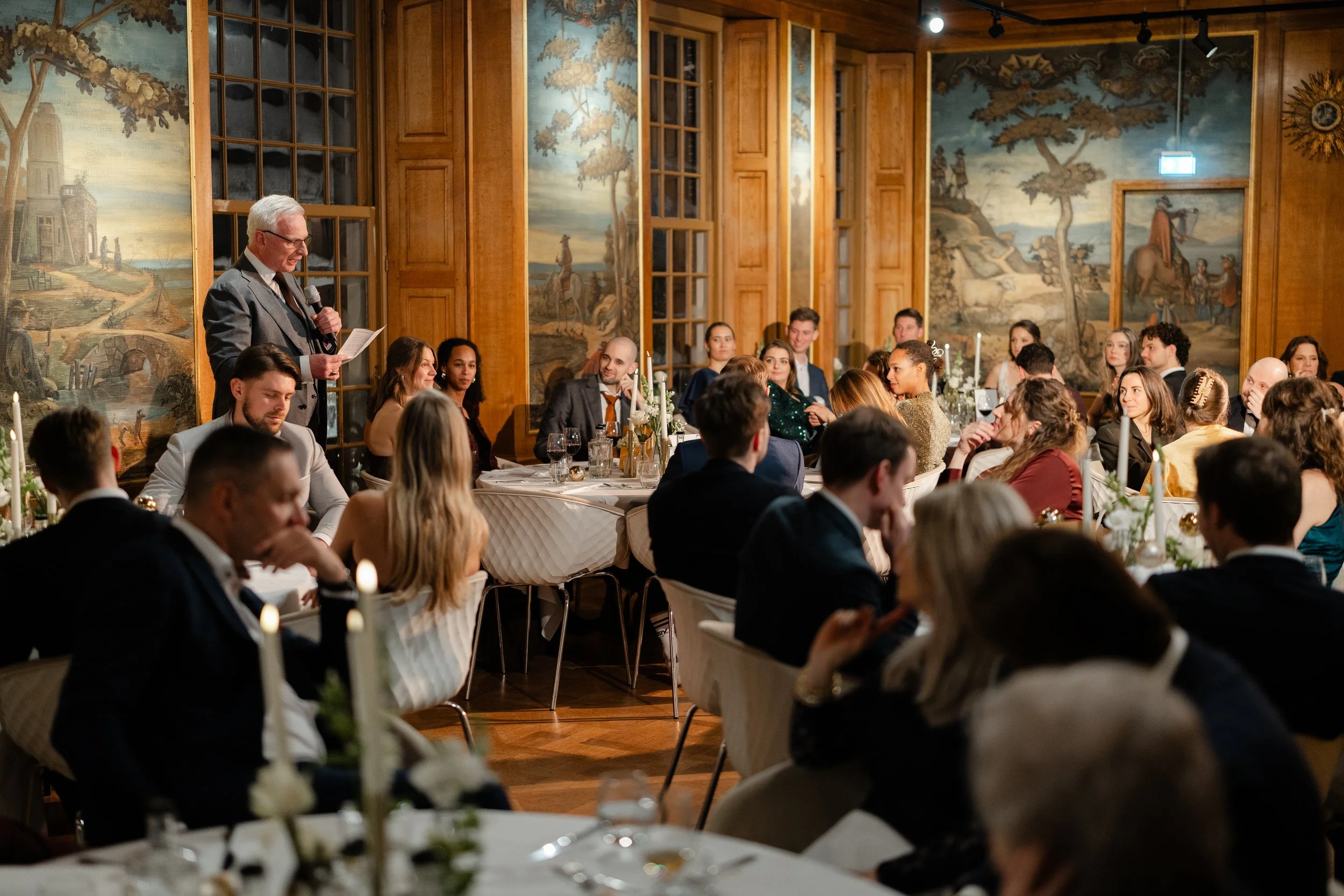 De ceremonie vond plaats in de Raadzaal. Emile kwam binnen met zijn moeder, Pleun met haar vader. Daarna volgden persoonlijke geloften, een kusmoment en samen weer naar buiten. Aansluitend trokken ze zich even terug en maakten ze hun entree voor taart en toast, met de moeders die het proostmoment openden. Super leuk moment.