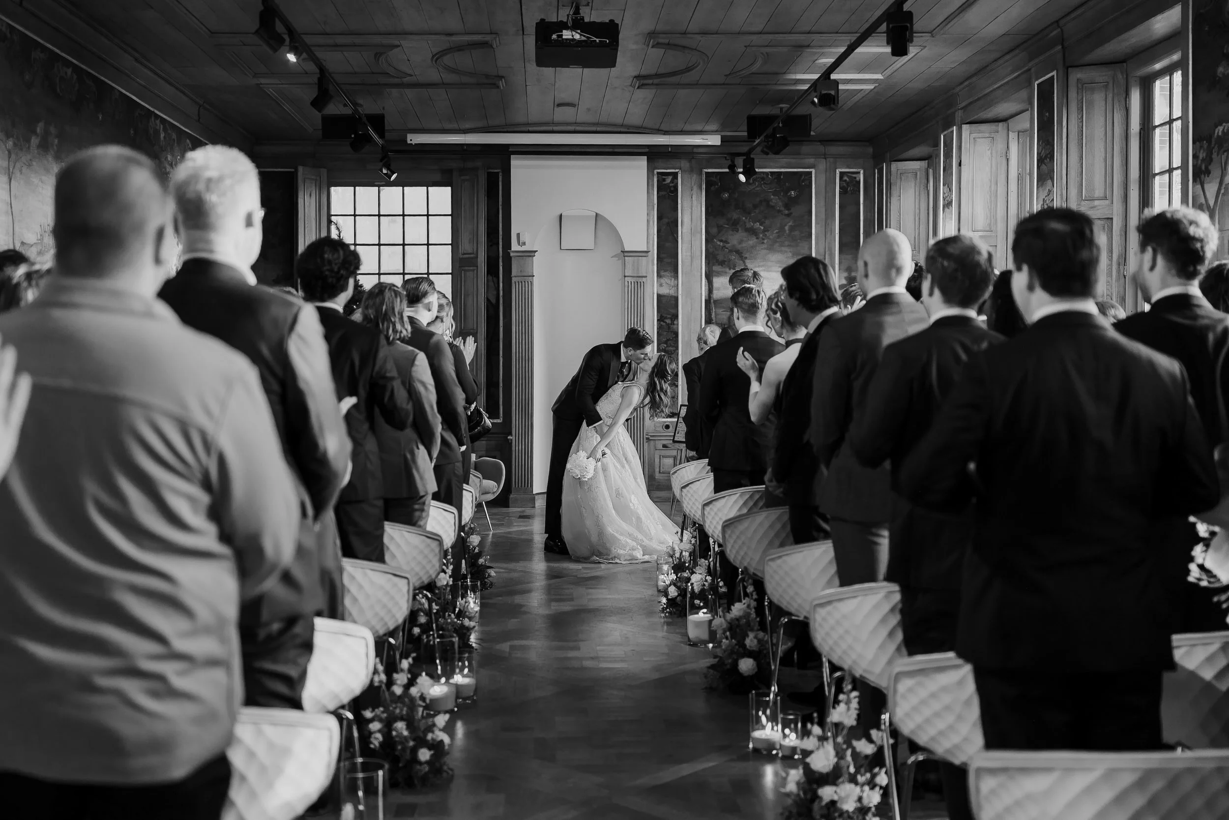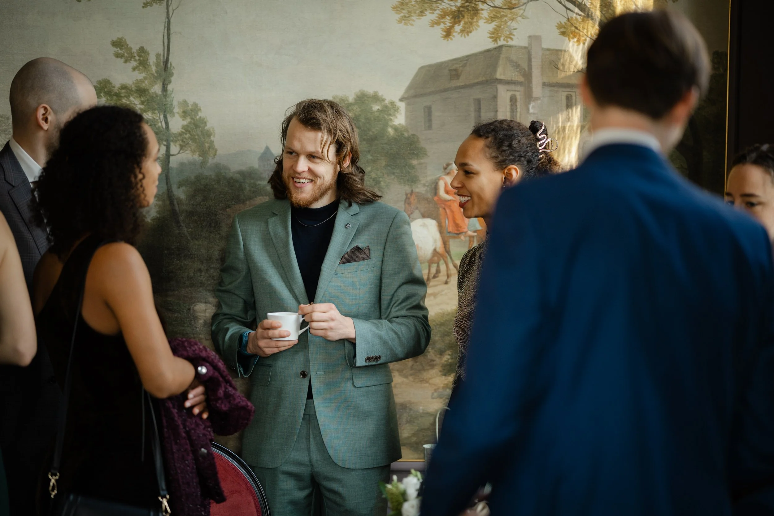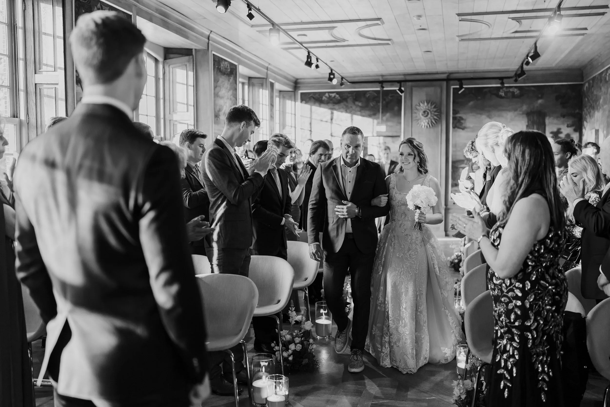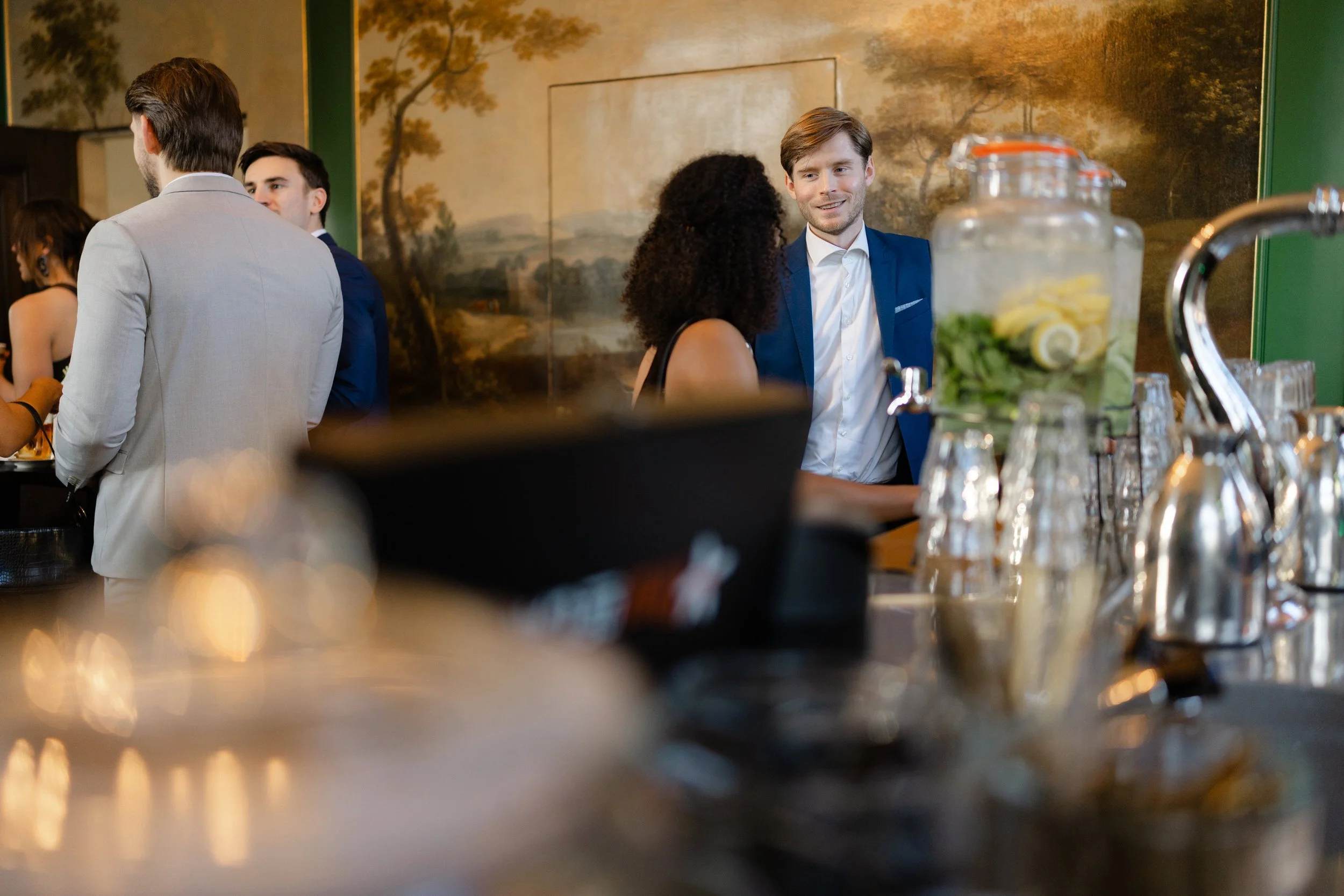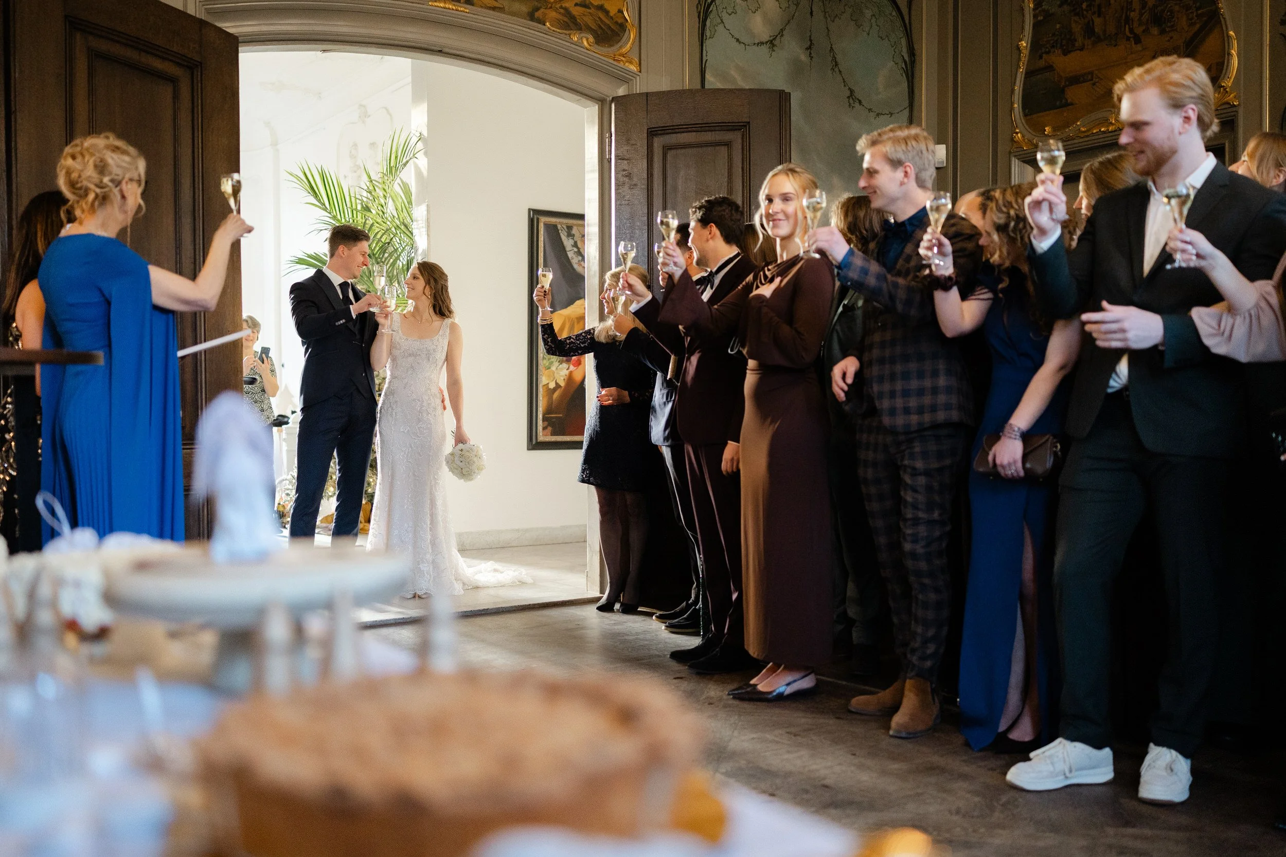 De ceremonie vond plaats in de Raadzaal. Emile kwam binnen met zijn moeder, Pleun met haar vader. Daarna volgden persoonlijke geloften, een kusmoment en samen weer naar buiten. Aansluitend trokken ze zich even terug en maakten ze hun entree voor taart en toast, met de moeders die het proostmoment openden. Super leuk moment.