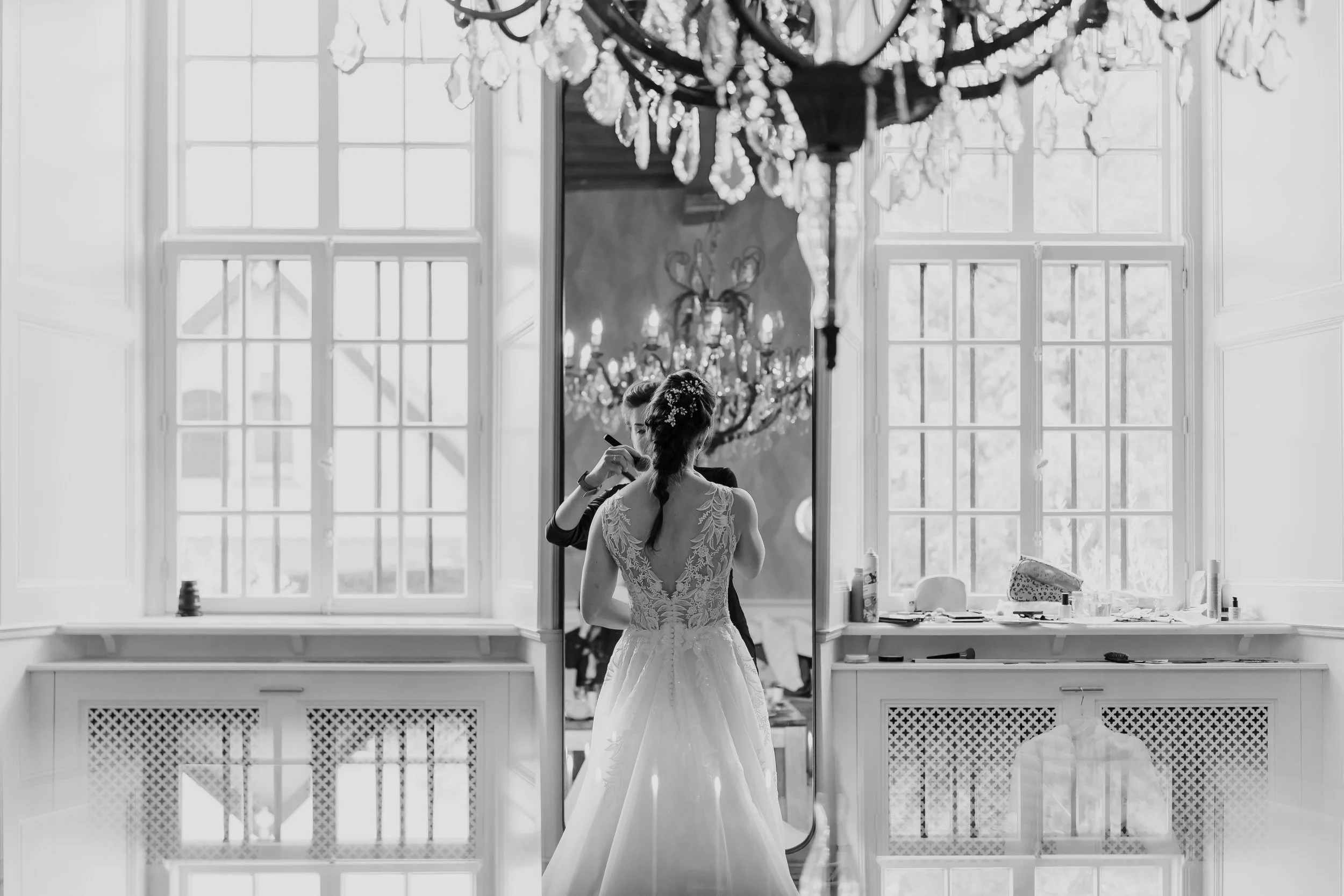 De dag begon met aankleden op Slot Doddendael. Robin startte om 10:30 uur in de suite boven. En hij kwam niet aanzetten met “gewoon een net pak”, maar met black tie. Zwart pak, strik, klaar. Eerlijk: hier zat ik al een tijd op te wachten. Eindelijk een bruidegom die dit aantrekt. Het geeft meteen een vibe, het staat strak op foto en met een witte jurk ernaast klopt het helemaal. I like! Aansluitend sloten we bij Yvonne om 11:00 uur aan die aan het einde van haar haar en make-up was. We pakten meteen de details die voor hen echt iets betekenen: de oorbellen van Yvonne (erfstuk) en de ring van Robin met een familiegeschiedenis. Om 12:00 was het tijd voor de first look. Zonder familie. Gewoon even samen.