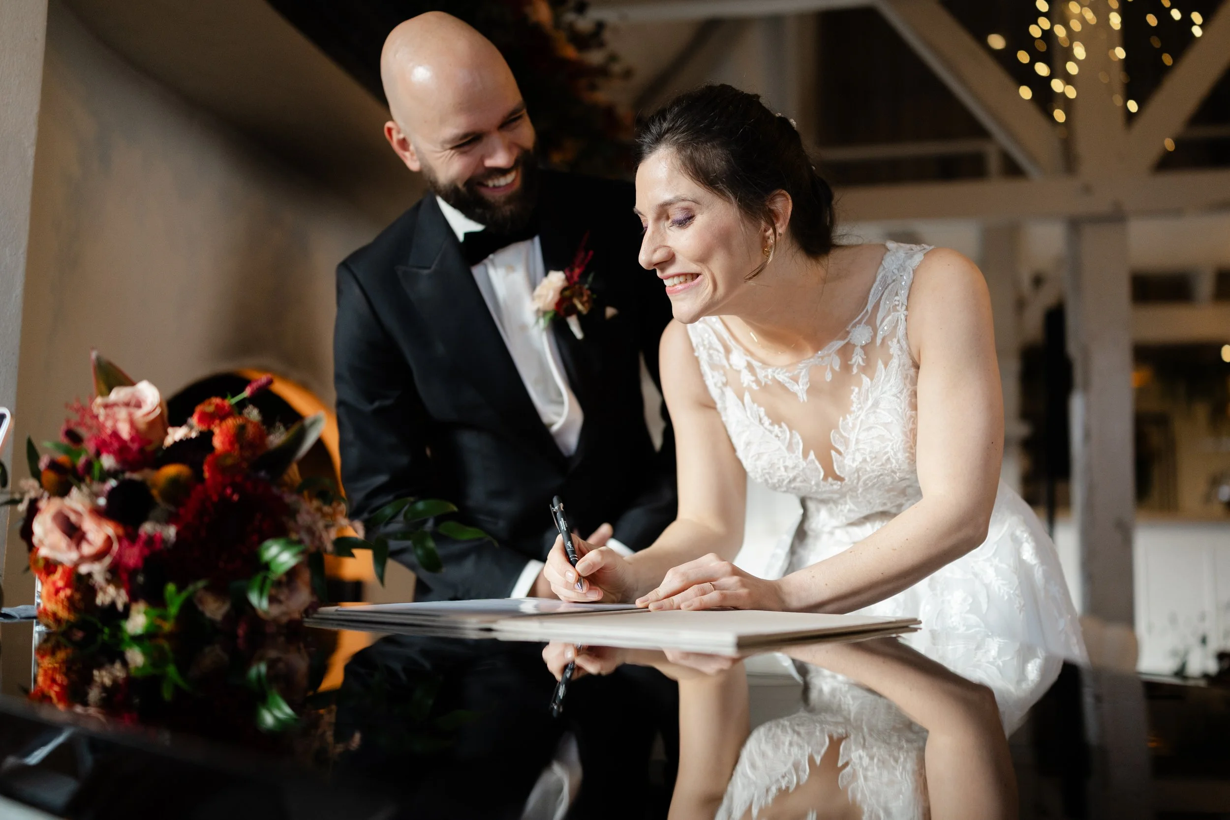 Rond 14:30 druppelden de gasten binnen op de binnenplaats bij het Arsenaal. Om 15:00 startte de ceremonie in ’t Spijcker. Yvonne en Robin kwamen samen op met “Outro – M83”. Dat nummer bleef de hele dag terugkomen, inclusief de “Now and Forever” knipoog. Oma bracht de ringen naar voren (met zichtbaar plezier). Er was live muziek van de nichtjes op viool en piano en de trouwakte werd ondertekend op de piano. Luizter leidde de ceremonie met gesproken stukken en zang.